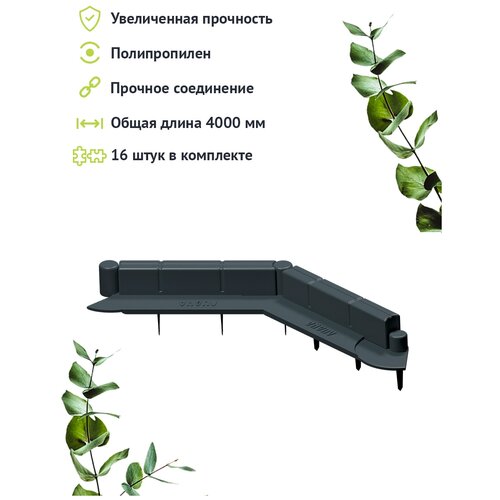 Специальная конструкция обеспечивает быстрый и легкий монтаж без использования инструментов. Для оптимальной установки рекомендуется рыхлить почву, удалять грубые камни и планировать неровности. Комплект бордюра состоит из 4 наборов по 4 секции(общее количество секций = 16 ед.