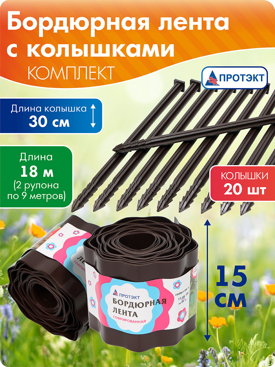 Комплект состоит: Бордюрная лента 2 ролика (общая длина 18 м), колышки 2 упаковки (всего 20 шт.)