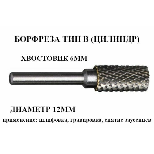 Твердосплавная борфреза тип B (12х25 мм; хв-к 6 мм) применяется на электрических и пневматических прямых шлифовальных машинках с цангой 6 мм. Предназначена для удаления заусенцев, обработки фасок, кромок отверстий, обработки сварных швов в труднодоступных местах.