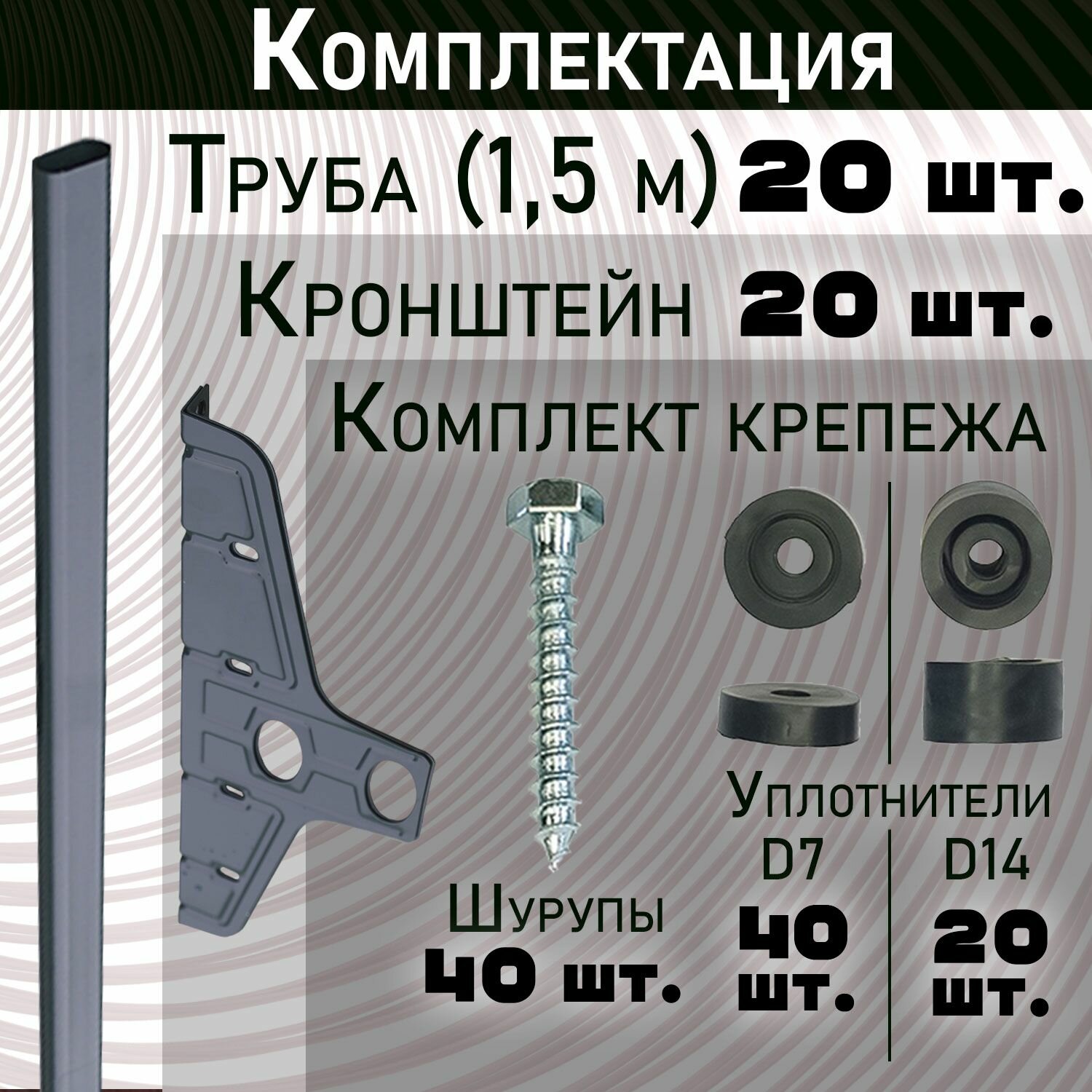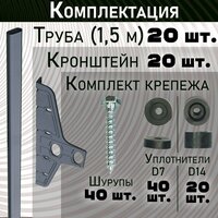 В комплект поставки входят 20 труб, 20 кронштейнов, комплект крепежа, инструкция по монтажу и фирменный скотч на концах упаковки трубы.