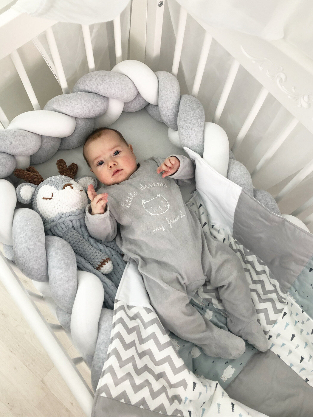 Бортик-коса изготовлен из мягкого хлопкового трикотажа, который не вызывает аллергии и подходит для новорожденных. Благодаря своей гибкости, бортик подойдет для любых видов кроватей, включая прямоугольные и круглые.