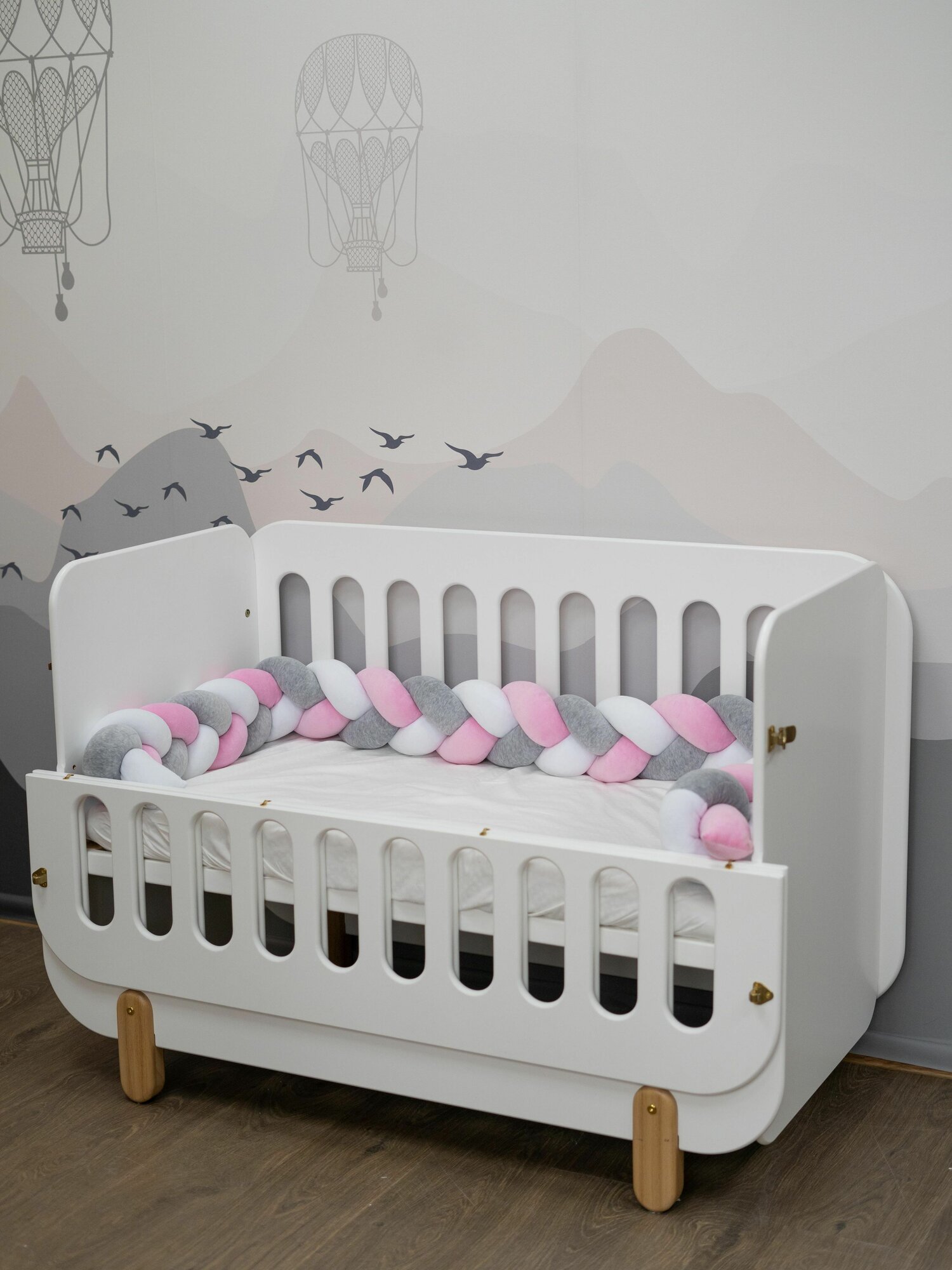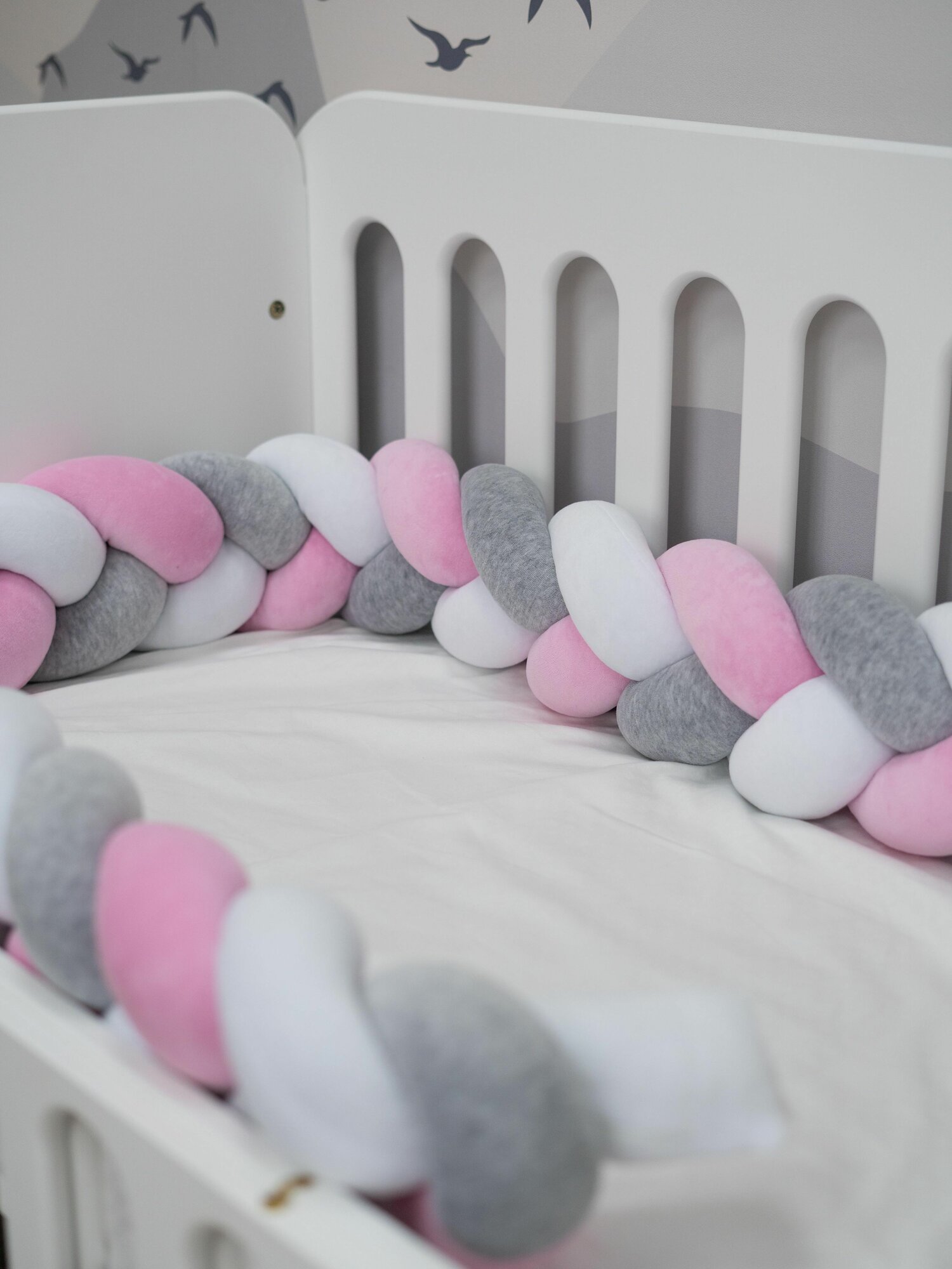 Бортик-коса Mirakids выполнен в трех цветах: розовый, серый и белый. Оттенок изделия может незначительно отличаться от фото.