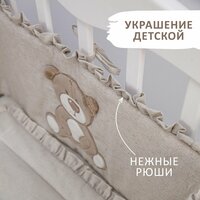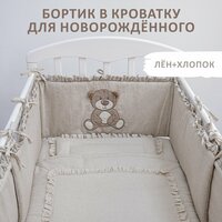 Бортик с рюшами в детскую кроватку в эко стиле обеспечит комфорт и безопасность малыша с рождения. Защитный бортик для кровати является полезным предметом для малыша, защищая его от ударов о бока, стенки, ограждение кроватки. Качественный мягкий борт антистресс, изготовлен из натуральной, не искусственной, тактильной ткани из льна и хлопка, основа наполнителя - гипоаллергенный материал синтепон. Подойдет для детской кроватки любого размера и формы. Он легко крепится к периметру кроватки и обеспечивает безопасность ребенка и спокойный сон. Тонкий, плоский дышащий заборчик (забор) - лучший вариант для безопасного использования. Ребенок не застрянет и не задохнется в толстом объеме бортика. Коврик прямоугольный, имеет окантовку по краю в тон основного тканевого полотна. Прост в уходе, не теряет первоначальный вид в процессе использования. Бортик имеет прочные, длинные завязки. Удобная система завязывания на шнурках позволяет легко закрепить его по периметру. Изделие продается в однотонном цвете бежевого оттенка с вышивкой Медвежонок. Защитный бортик станет универсальным аксессуаром в комнате младенца, идеальным, оригинальным сюрпризом на выписку из роддома, на крестины крестнице, крестнику или на новый год (нг) в качестве новогоднего, рождественского презента мальчику, девочке, маленькому племяннику, племяннице, на день рождения (др) любимой сестре(сестренке); младшему братику(брату), внуку, внучке, дочке, сыну на годик, молодым родителям на новоселье; будущей маме (мамочке), беременной подруге в ожидании бэйби. Приобретайте бортики в кровать защитные - лучшие товары российского бренда Kiriya kids (Кирия Кидс). В нашем магазине вы найдете большой выбор принадлежностей для детей и их родителей!