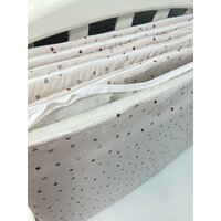 Плоские бортики со съемными чехлами - идеальное решение для ценителей пространства в детской кроватке. Качественные и красивые бортики для детской кроватки защитят Вашего малыша, а также придадут красивый вид. В состав комплекта входят 4 бортика. Они подойдут и мальчику, и девочке. Бортики тонкие (толщина - 2 см), так что что не занимают много места в кроватке и не съедают пространство. Наши бортики в кроватку для новорожденного сшиты из качественного хлопка и сертифицированного гипоаллергенного наполнителя – файбер хард. Имеют много прочных завязок, так что бортики будут крепко держаться на кроватки малыша. У бортиков съемные чехлы на молниях, что очень удобно при уходе, вы легко сможете снять их и постирать. Снять чехлы, стирать на деликатном режиме при средних оборота детским моющим средством без отбеливателя, при температуре не более 30 градусов.