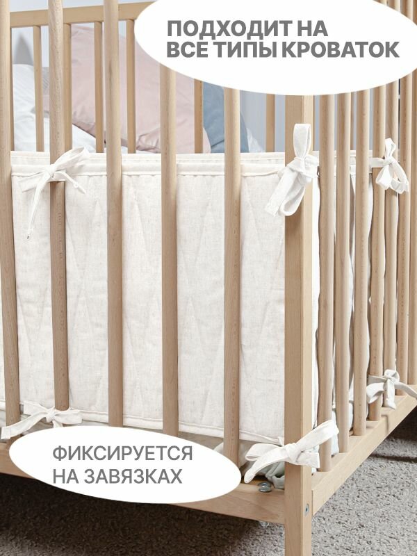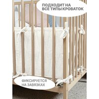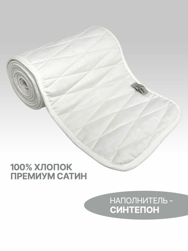 Бортик в детскую кроватку в эко стиле обеспечит комфорт и безопасность малыша с рождения. Защищает малыша от ударов о бока, стенки, ограждение кроватки. Мягкий борт антистресс, изготовлен из натуральной, не искусственной, тактильной ткани премиум сатин, основа наполнителя - гипоаллергенный материал синтепон. Подойдет для детской кроватки любого размера и формы. Тонкий, плоский дышащий заборчик - лучший вариант для безопасного использования. Ребенок не застрянет и не задохнется в толстом объеме бортика. Коврик прямоугольный, имеет окантовку по краю. Прост в уходе, не теряет первоначальный вид в процессе использования. Прочные, длинные завязки (шнурки), позволяют легко закрепить бортик по периметру спального места или на других поверхностях, завязав на бантик(бант). Изделие продается в однотонном белом цвете , без рисунка в двух размерах 1,8 и 3,65 метра. Украшено нитяной геометрической стежкой в виде ромбов. Упакован товар в оригинальную, подарочную упаковку - мешочек на затягивающемся шнурке. Красивый мешок оформлен нежным, интересным принтом с изображением милого, спящего мишки (медведя, мишутки, медвежонка). Такая прикольная, необычная упаковка очень практична, удобна для хранения. В ней можно хранить складной защитный бортик для кровати в рулоне или подарить, не покупая подарочный пакет. Обладая компактным размером бортики на кровать защитные, станут неотъемлемой частью интерьера квартиры, комнаты крохи или украшением домашнего декора. Бортик - универсальный аксессуар в комнате младенца, оригинальный сюрприз на выписку из роддома, на крестины крестнице, крестнику, в качестве презента мальчику, девочке, маленькому племяннику, племяннице, на день рождения (др) любимой сестре; младшему братику(брату), внуку, внучке, дочке, сыну на годик, молодым родителям на новоселье; будущей маме(мамочке), беременной подруге в ожидании бэйби. Приобретайте защитный бортик на кровать и другие лучшие товары российского бренда Kiriya kids (Кирия Кидс).