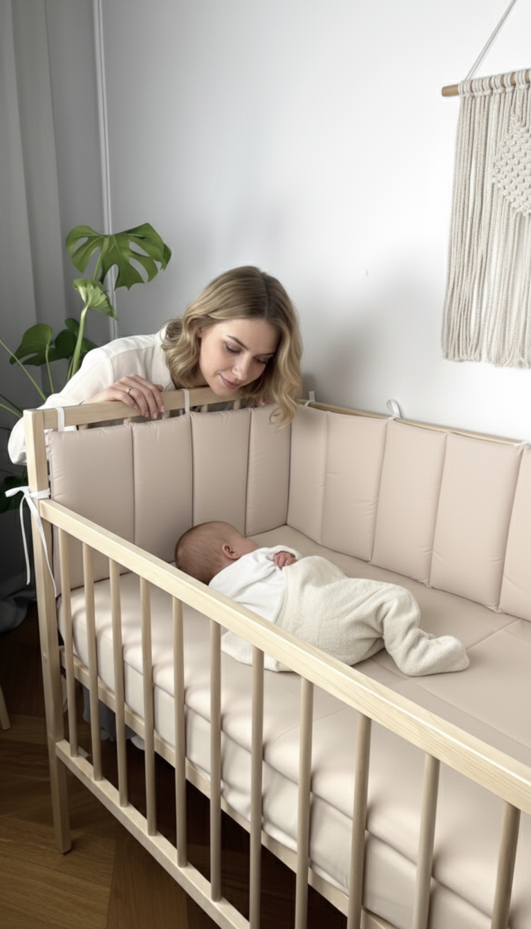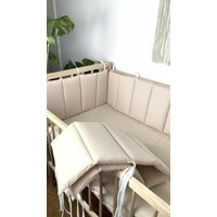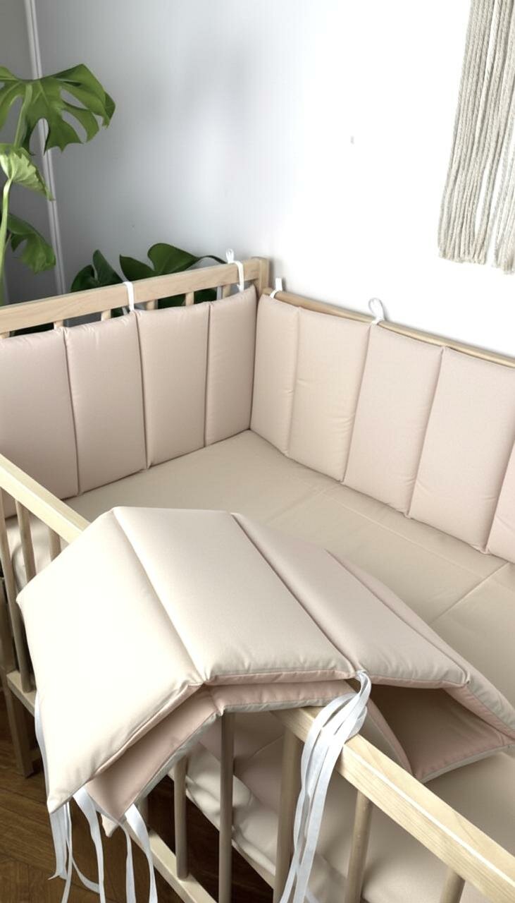 Подарите своему малышу максимальный уют и безопасность с нашими бортиками из высококачественного турецкого хлопка. Этот комплект предназначен для защиты на 4 стороны кроватки и создает идеальное пространство для крепкого сна. Преимущества и особенности: · Идеальная длина: Бортик состоит из 2 штук 120×30см и 2 штук 60×30см, общая длина 360 см равномерно распределяется на три стороны кроватки, обеспечивая защиту и в то же время вы всегда можете видеть малыша. · Турецкий хлопок: Знаменитый своим качеством, мягкостью и долговечностью. Ткань гипоаллергенна, отлично пропускает воздух и впитывает влагу, обеспечивая комфортный микроклимат. · Безопасность прежде всего: Мягкий синтетический наполнитель (холлофайбер) хорошо держит форму, но при этом не создает риска перегрева. Бортики не являются слишком объемными, что соответствует современным рекомендациям по безопасному сну. · Удобство в использовании: Надежные завязки позволяют прочно зафиксировать бортики на прутьях кроватки. Изделие легко снимается для стирки. · Стильный дизайн: Нежный цвет и классический дизайн прекрасно впишутся в интерьер любой детской комнаты. Характеристики: · Материал: 100% турецкий хлопок · Наполнитель: холлофайбер · Общая длина: 360 см (на 4 стороны кроватки) Выбирая нас, Вы выбираете качество и безопасность для вашего малыша, а также красивое и уютное гнездышко. Внимание! При пошиве мы используем специальные термо чернила, с помощью них мы размечаем стежку на изделиях и делаем необходимые пометки. Данные чернила удаляются с помощью утюга на этапе сборки продукции, но выяснилось, что в морозную погоду при доставке они могут проявиться. Просим Вас не относиться к данному факту как к браку, а просто пройтись утюгом и чернила мгновенно исчезнут