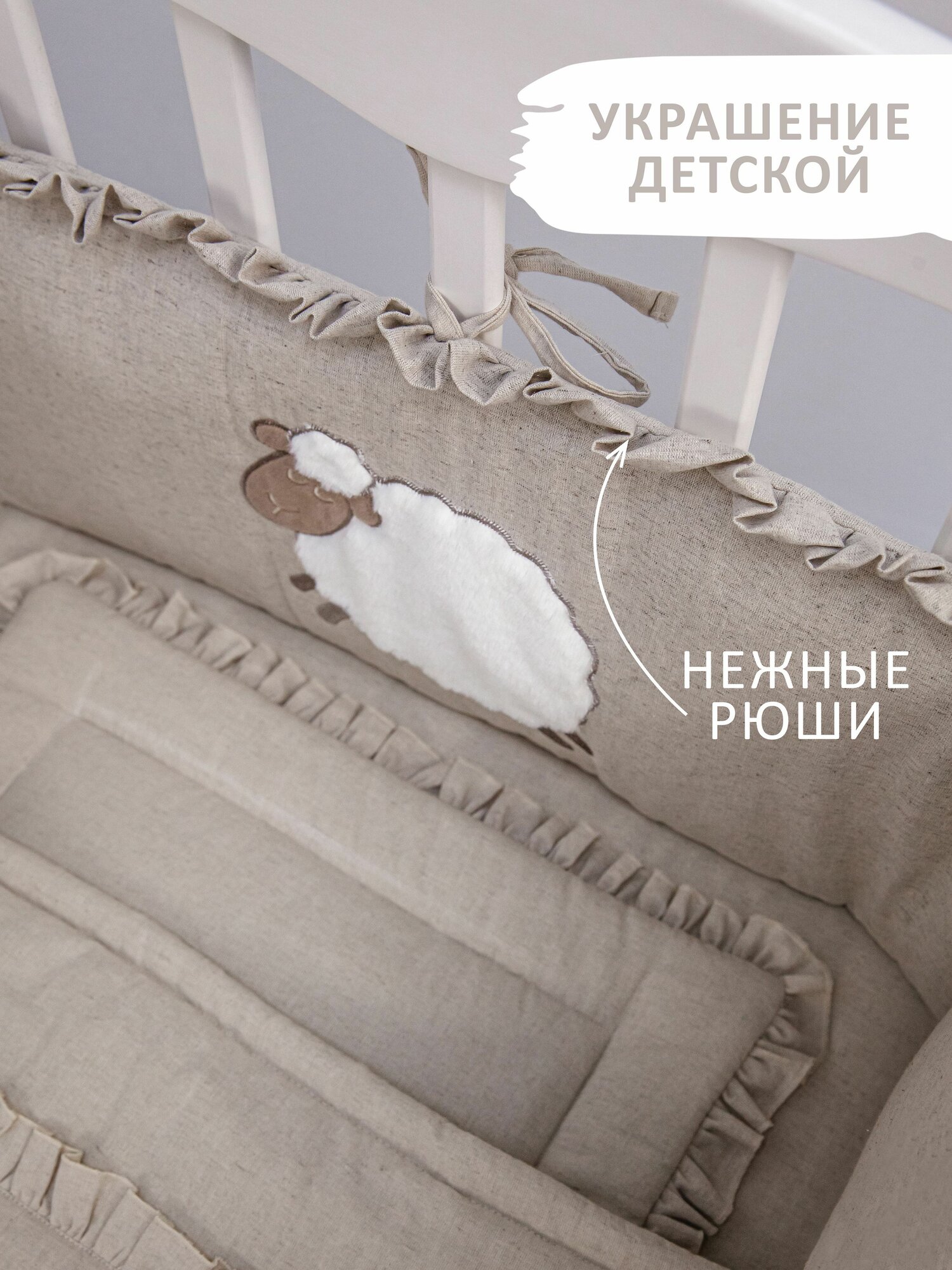 Бортик с рюшами в детскую кроватку в эко стиле обеспечит комфорт и безопасность малыша с рождения. Защитный бортик для кровати является полезным предметом для малыша, защищая его от ударов о бока, стенки, ограждение кроватки. Качественный мягкий борт антистресс, изготовлен из натуральной, не искусственной, тактильной ткани из льна и хлопка, основа наполнителя - гипоаллергенный материал синтепон. Подойдет для детской кроватки любого размера и формы. Он легко крепится к периметру кроватки и обеспечивает безопасность ребенка и спокойный сон. Тонкий, плоский дышащий заборчик (забор) - лучший вариант для безопасного использования. Ребенок не застрянет и не задохнется в толстом объеме бортика. Коврик прямоугольный, имеет окантовку по краю в тон основного тканевого полотна. Прост в уходе, не теряет первоначальный вид в процессе использования. Бортик имеет прочные, длинные завязки. Удобная система завязывания на шнурках позволяет легко закрепить его по периметру. Изделие продается в однотонном цвете бежевого оттенка с вышивкой Овечка. Защитный бортик станет универсальным аксессуаром в комнате младенца, идеальным, оригинальным сюрпризом на выписку из роддома, на крестины крестнице, крестнику или на новый год (нг) в качестве новогоднего, рождественского презента мальчику, девочке, маленькому племяннику, племяннице, на день рождения (др) любимой сестре(сестренке); младшему братику(брату), внуку, внучке, дочке, сыну на годик, молодым родителям на новоселье; будущей маме (мамочке), беременной подруге в ожидании бэйби. Приобретайте бортики в кровать защитные - лучшие товары российского бренда Kiriya kids (Кирия Кидс). В нашем магазине вы найдете большой выбор принадлежностей для детей и их родителей!