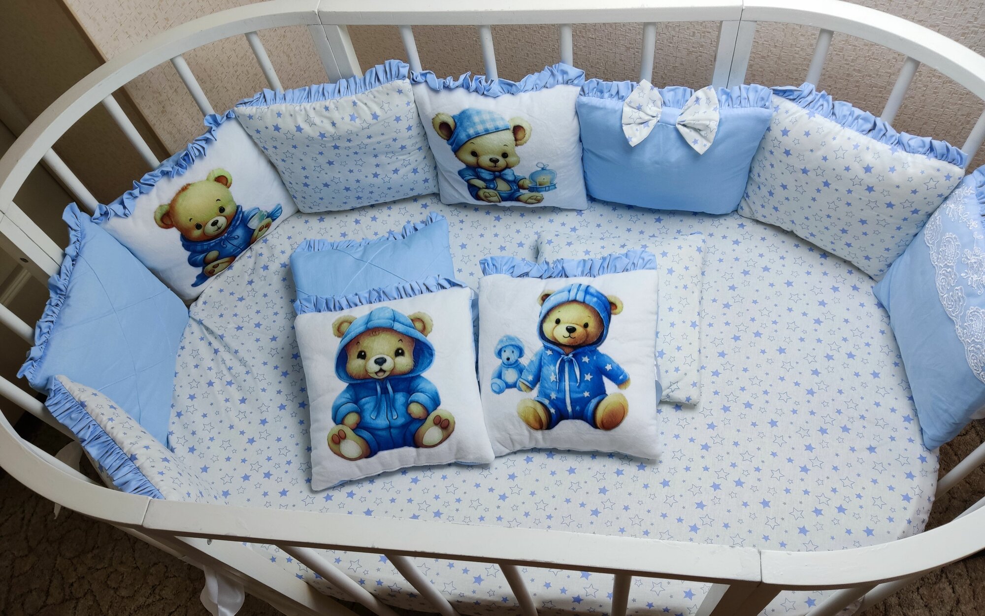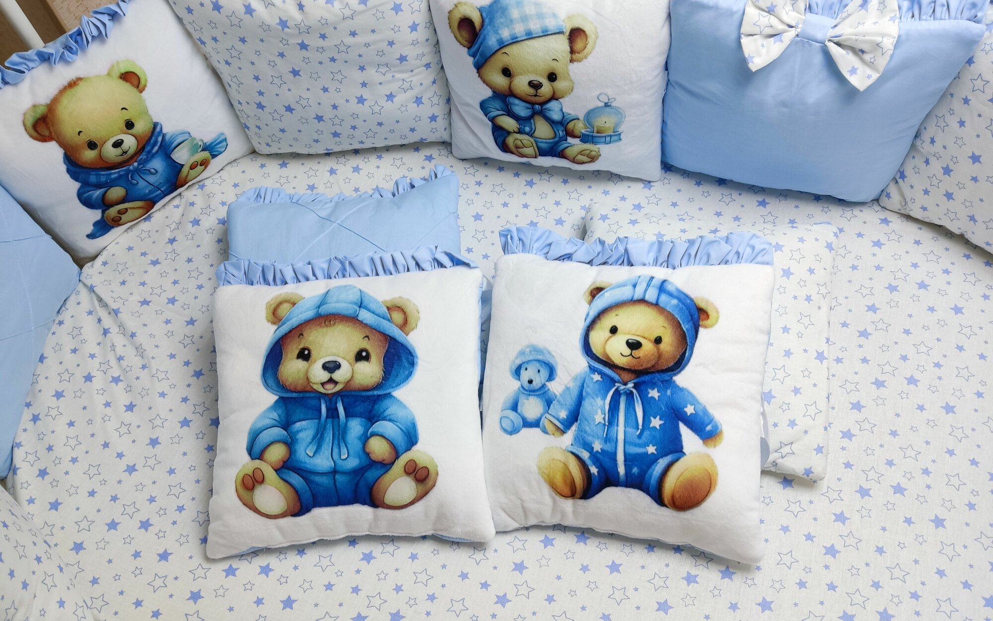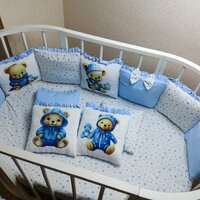 В комплекте 12 бортиков-подушек, украшенных фотопечатью на велюре. Бант на завязке.