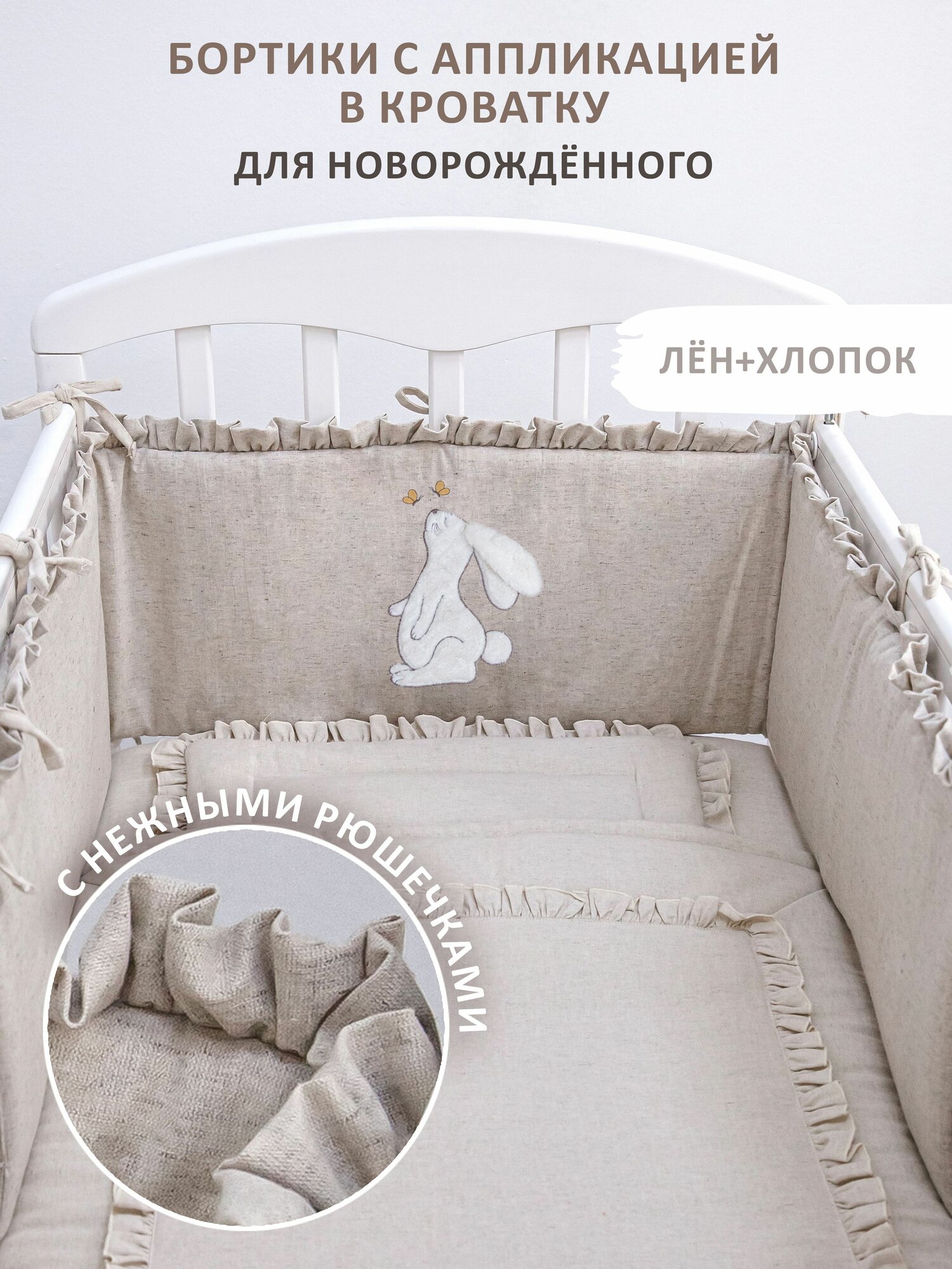 Бортик с рюшами в детскую кроватку в эко стиле обеспечит комфорт и безопасность малыша с рождения. Защитный бортик для кровати является полезным предметом для малыша, защищая его от ударов о бока, стенки, ограждение кроватки. Качественный мягкий борт антистресс, изготовлен из натуральной, не искусственной, тактильной ткани из льна и хлопка, основа наполнителя - гипоаллергенный материал синтепон. Подойдет для детской кроватки любого размера и формы. Он легко крепится к периметру кроватки и обеспечивает безопасность ребенка и спокойный сон. Тонкий, плоский дышащий заборчик (забор) - лучший вариант для безопасного использования. Ребенок не застрянет и не задохнется в толстом объеме бортика. Коврик прямоугольный, имеет окантовку по краю в тон основного тканевого полотна. Прост в уходе, не теряет первоначальный вид в процессе использования. Бортик имеет прочные, длинные завязки. Удобная система завязывания на шнурках позволяет легко закрепить его по периметру. Изделие продается в однотонном цвете бежевого оттенка с объемной аппликацией «Зайчик». Защитный бортик станет универсальным аксессуаром в комнате младенца, идеальным, оригинальным сюрпризом на выписку из роддома, на крестины, молодым родителям на новоселье; будущей маме, беременной подруге в ожидании бэйби. Приобретайте бортики в кровать защитные - лучшие товары российского бренда Kiriya kids (Кирия Кидс). В нашем магазине вы найдете большой выбор принадлежностей для детей и их родителей!