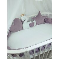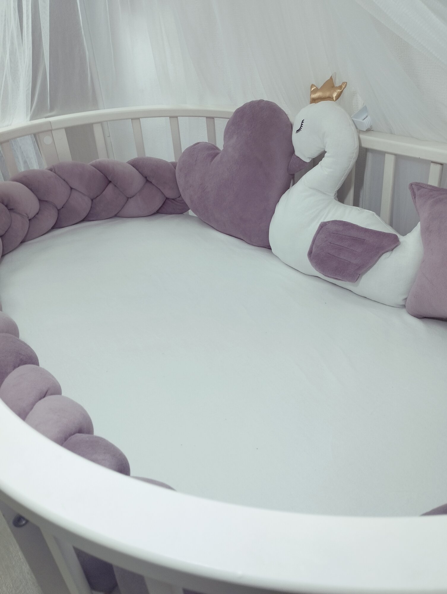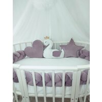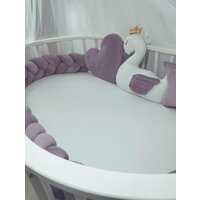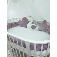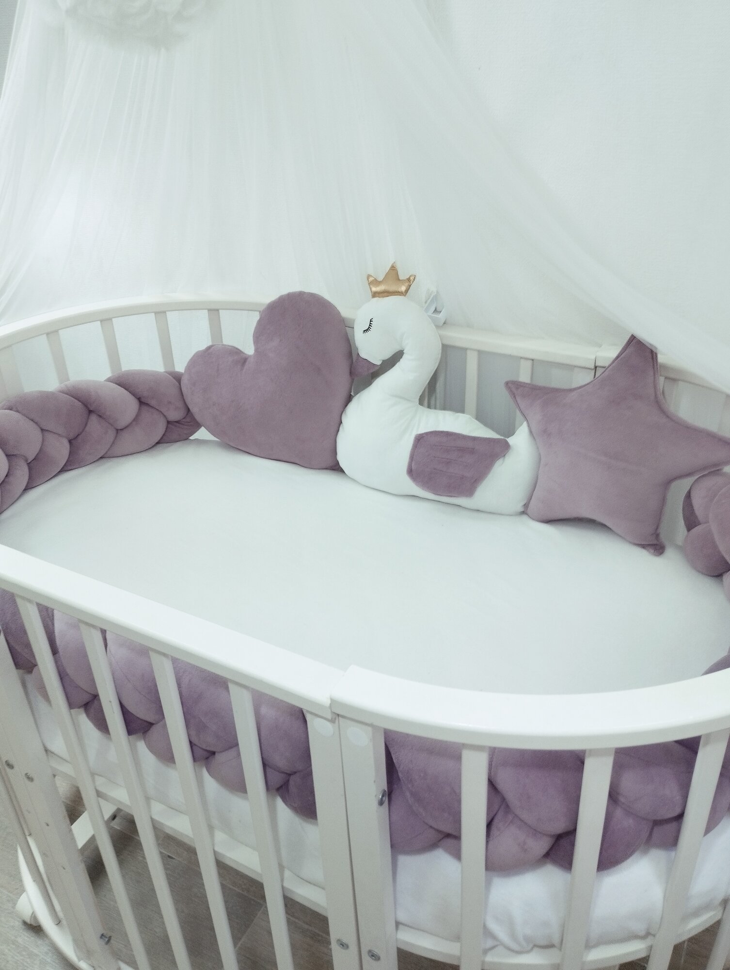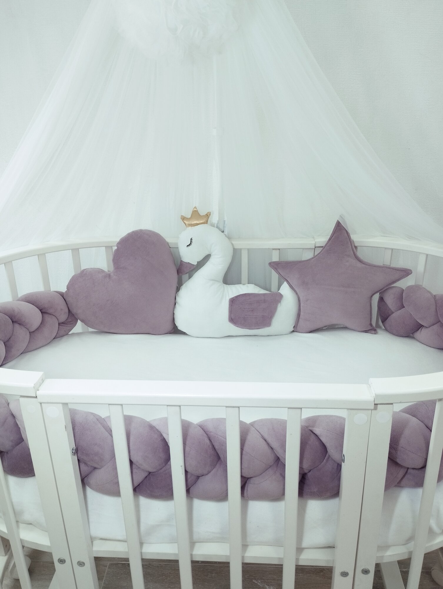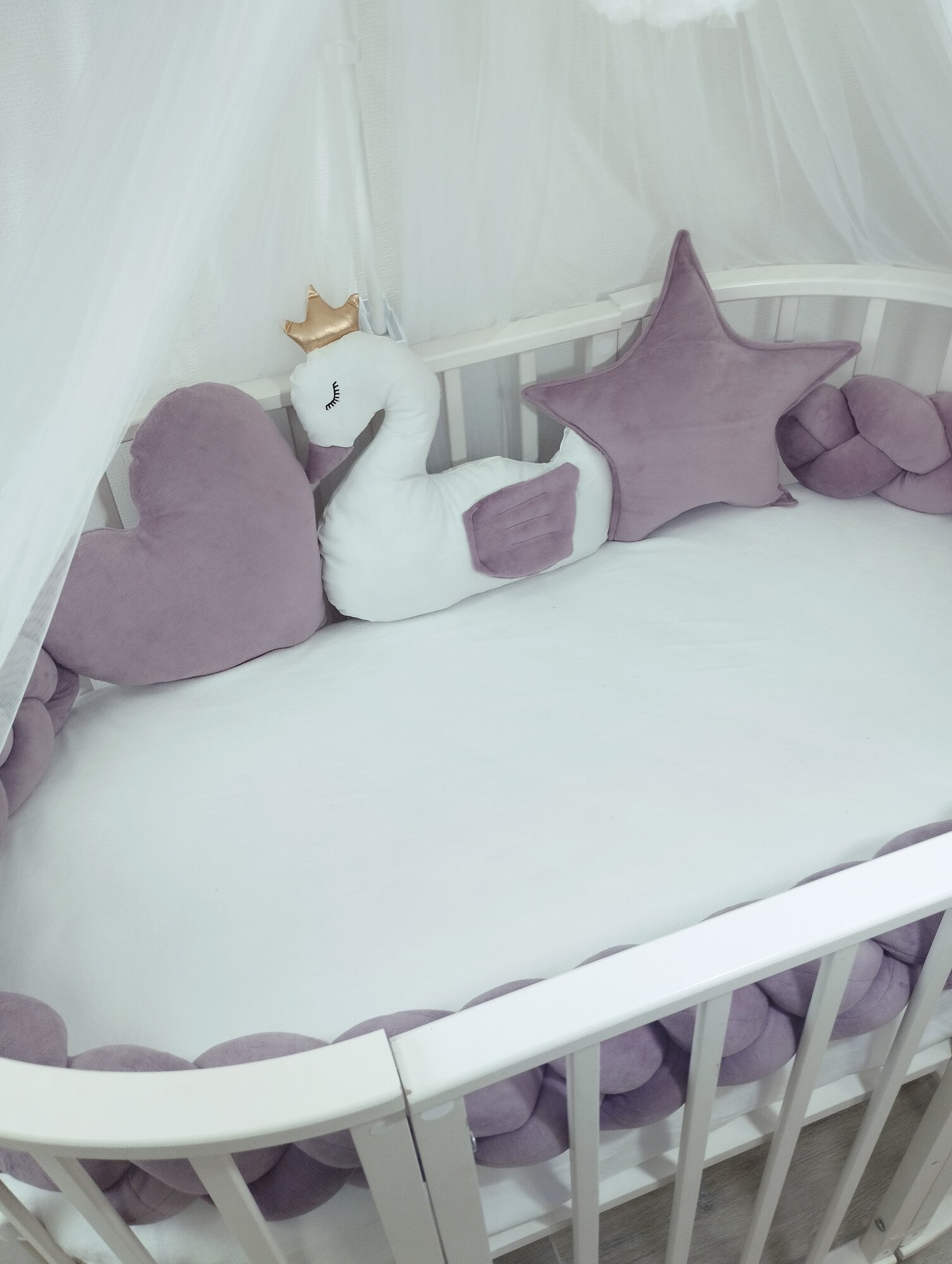 Комплект бортиков в кроватку для новорожденных, мягкая велюровая косичка и 3 подушки: облачко, звезды или милые зверушки из натурального хлопка (сатин). Множество расцветок помогут выбрать комплект как для девочки, так и для мальчика. Бортик коса заплетен в 3 пряди, высота 15см. Облачко и звезды высотой 35см. По бокам подушек прочные репсовые ленты для фиксации к стенкам кроватки, для косички также в комплекте ленточки, чтобы надежно зафиксировать бортик. Наши бортики создадут уютное пространство в кроватке младенца, надежно защитят от ударов о стенки и не дадут застрять ножке или ручке малыша между рейками кроватки. Бортики просты в уходе, чехлы несъемные, изделия можно и нужно стирать целиком, в стиральной машине на 30 градусов и минимальных оборотах на отжим. Качественный хлопковый велюр в косичке и натуральный сатин на игрушках выдержат множество стирок, не полиняют и не покроются катышками. Гипоаллергенный холлофайбер не комкуется, бортики не потеряют внешний вид после стирок, не требуют глажки, достаточно пройтись паром по сатиновым подушкам. Разные фактуры ткани подобраны не случайно, младенцам важно познавать мир тактильно и узнавать новые текстуры. Мы используем машинную вышивку на мордочках игрушек, вместо аппликаций, бусин и прочих мелких деталей, чтобы любознательные крохи не оторвали заинтересовавшие их вещи. Бортики в кроватку - прекрасный подарок на выписку, на рождение ребенка, молодой маме, внуку или внучке. Подходят для всех типов кроваток: круглой, овальной и прямоугольной.