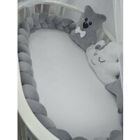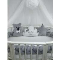 Комплект бортиков в кроватку для новорожденных, мягкая велюровая косичка и 3 подушки: облачко, звезды или милые зверушки из натурального хлопка (сатин). Множество расцветок помогут выбрать комплект как для девочки, так и для мальчика. Бортик коса заплетен в 3 пряди, высота 15см. Облачко и звезды высотой 35см. По бокам подушек прочные репсовые ленты для фиксации к стенкам кроватки, для косички также в комплекте ленточки, чтобы надежно зафиксировать бортик. Наши бортики создадут уютное пространство в кроватке младенца, надежно защитят от ударов о стенки и не дадут застрять ножке или ручке малыша между рейками кроватки. Бортики просты в уходе, чехлы несъемные, изделия можно и нужно стирать целиком, в стиральной машине на 30 градусов и минимальных оборотах на отжим. Качественный хлопковый велюр в косичке и натуральный сатин на игрушках выдержат множество стирок, не полиняют и не покроются катышками. Гипоаллергенный холлофайбер не комкуется, бортики не потеряют внешний вид после стирок, не требуют глажки, достаточно пройтись паром по сатиновым подушкам. Разные фактуры ткани подобраны не случайно, младенцам важно познавать мир тактильно и узнавать новые текстуры. Мы используем машинную вышивку на мордочках игрушек, вместо аппликаций, бусин и прочих мелких деталей, чтобы любознательные крохи не оторвали заинтересовавшие их вещи. Бортики в кроватку - прекрасный подарок на выписку, на рождение ребенка, молодой маме, внуку или внучке. Подходят для всех типов кроваток: круглой, овальной и прямоугольной.