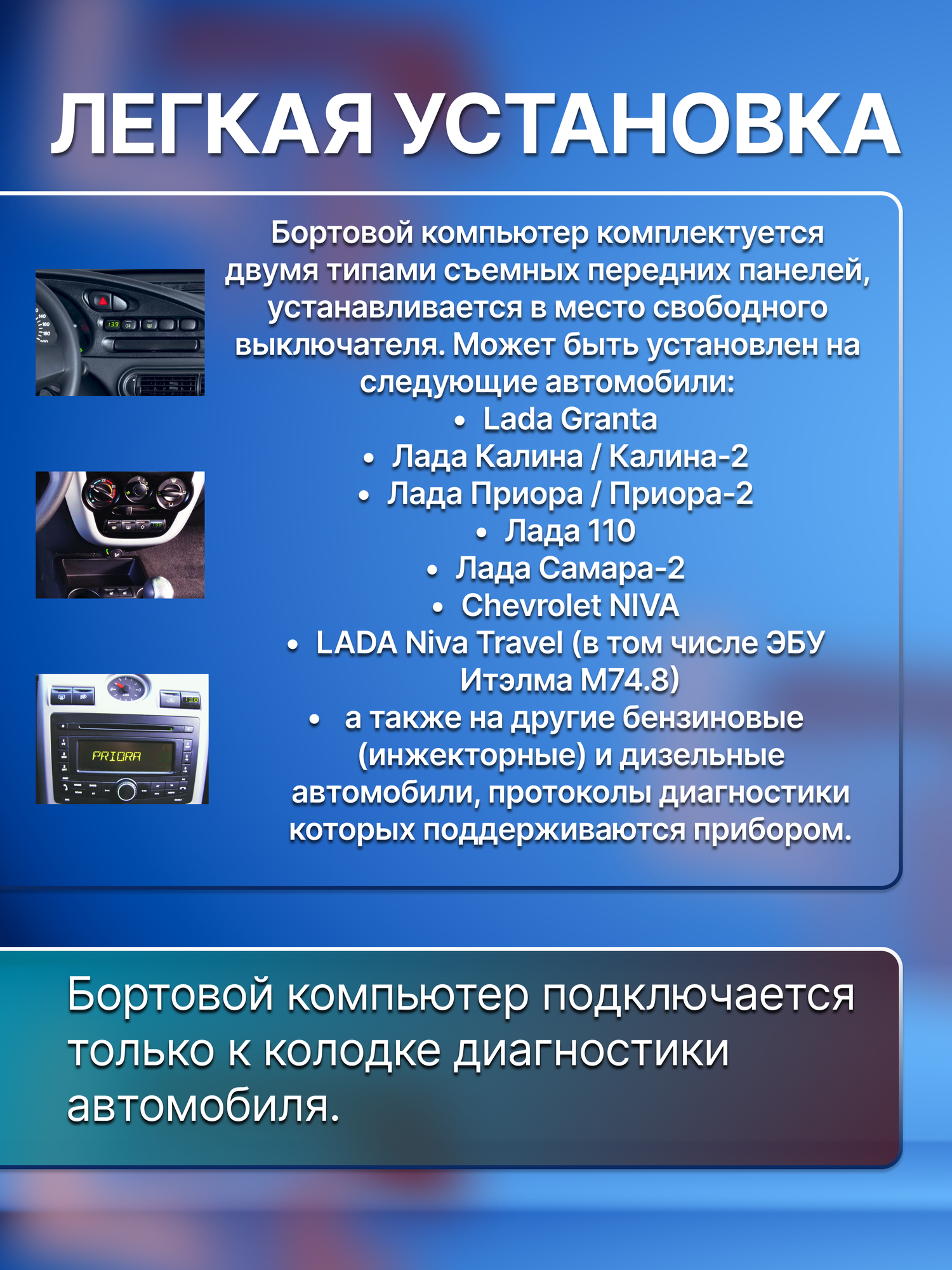 Бортовой компьютер комплектуется двумя типами съемных передних панелей, устанавливается в место свободного выключателя. Может быть установлен на следующие автомобили: