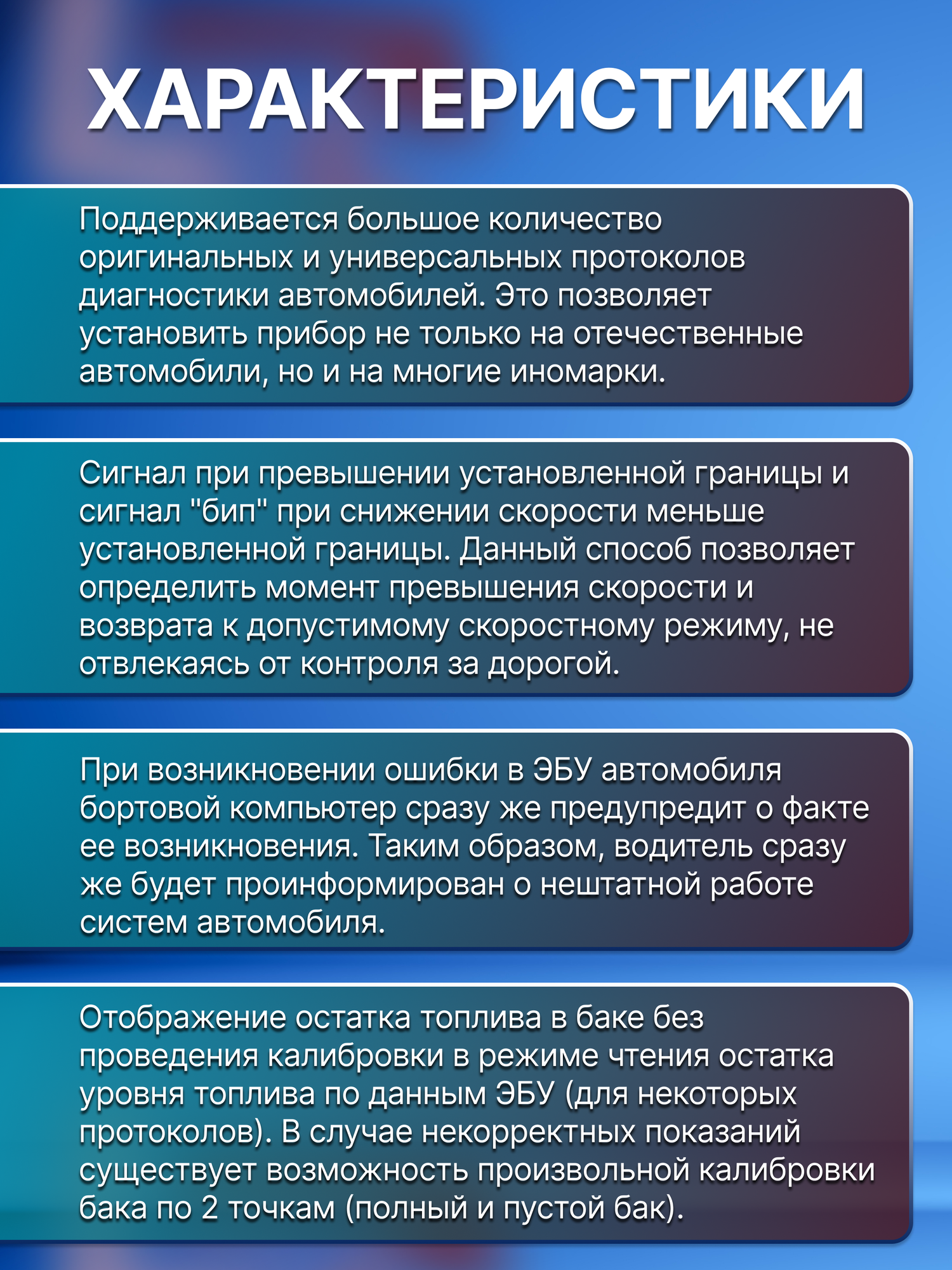 Поддерживается большое количество оригинальных и универсальных протоколов диагностики автомобилей. Это позволяет установить прибор не только на отечеcтвенные автомобили, но и на многие иномарки.
