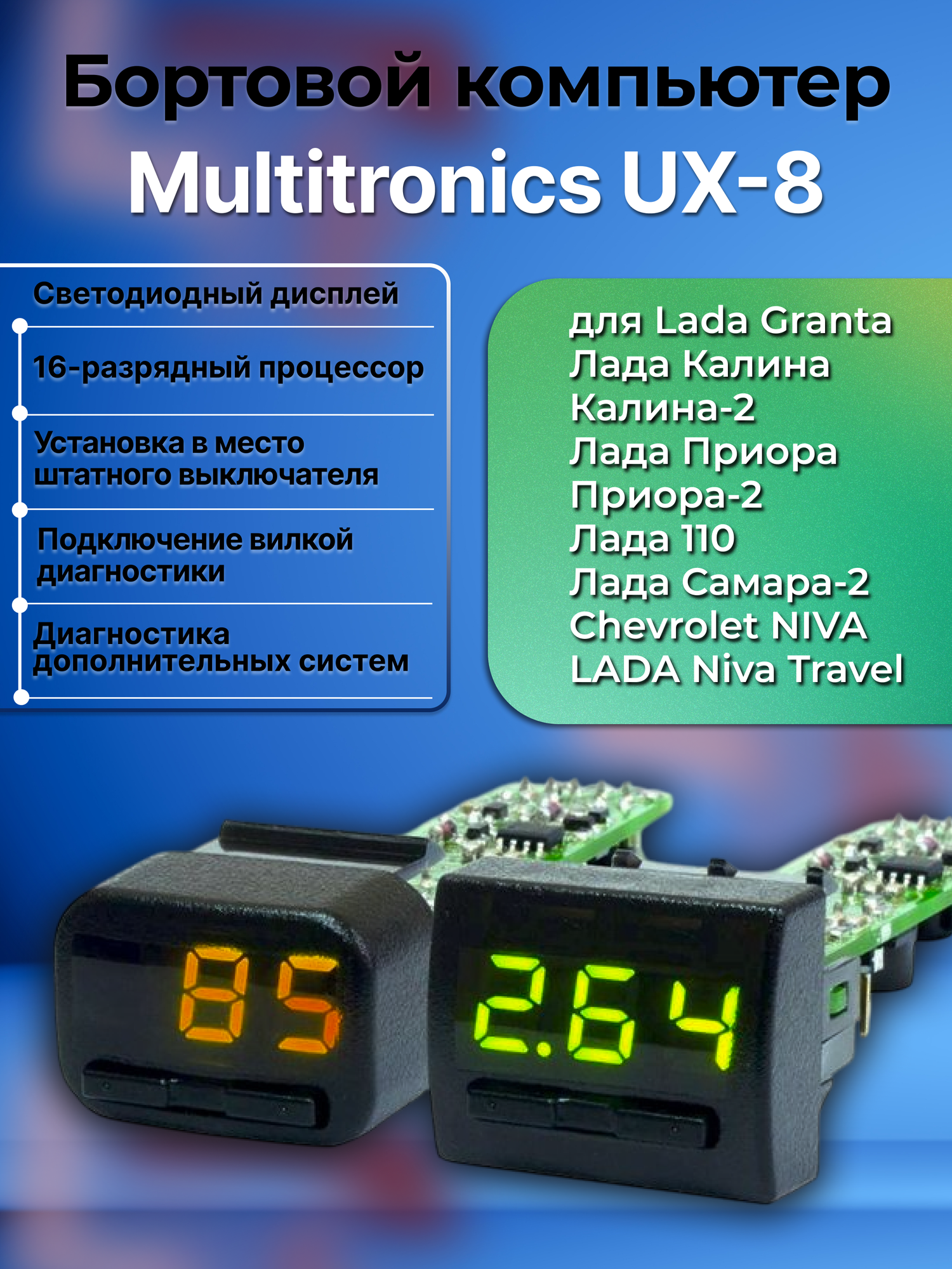 Маршрутный бортовой компьютер Multitronics UX-7 применяется на автомобилях Lada Granta, Лада Калина Калина-2, Лада Приора Приора-2, Лада 110, Лада Самара-2, Chevrolet-NIVA а также для дизельных и бензиновых а м, работающих с протоколами диагностики, поддерживаемыми прибором. Конструктивная совместимость зависит от типа и наличия свободных переключателей а м.