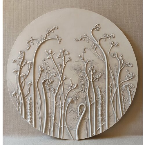 Ботанический барельеф - это изысканное решение для декора Вашего интерьера. Изготовленное вручную, панно представляет собой оттиск живых растений, который повторяет все тонкости их рельефа. Барельеф выполнен из высокопрочного гипса. Использованы лесные растения. Диаметр 49 см, цвет серый, есть подвес для размещения на стене. Наиболее эффектно рельеф растений подчёркивает боковой свет. Мягкие оттенки и изящные линии делают это панно прекрасным подарком для любого случая и дарят эстетическое удовольствие своему обладателю. Ботанический барельеф - это не просто украшение, но и способ выразить свою любовь к природе.