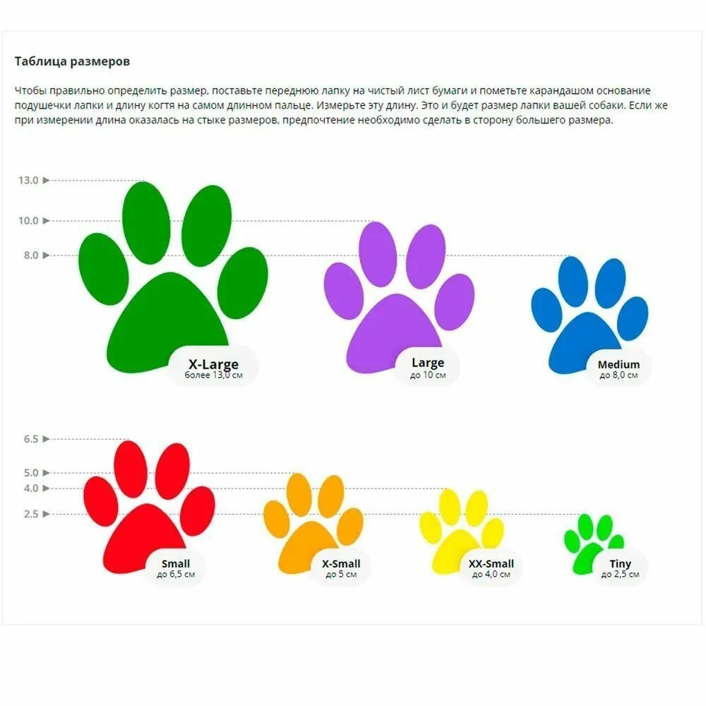 Материал - натуральный эластичный каучук. 100% биоразлагаемый материал. Эта обувь имеет настолько небольшой вес, что собака к ней привыкает практически сразу. Она ей просто не мешает. Также она быстро и просто моется. Модель обуви выпускается в разных цветах и размерах. В комплекте 12 штук - 3 комплекта по 4 штуки. Между использованием обуви рекомендуется очищать ее и пересыпать тальком, чтобы не слипалась.Подойдет для пород собак: