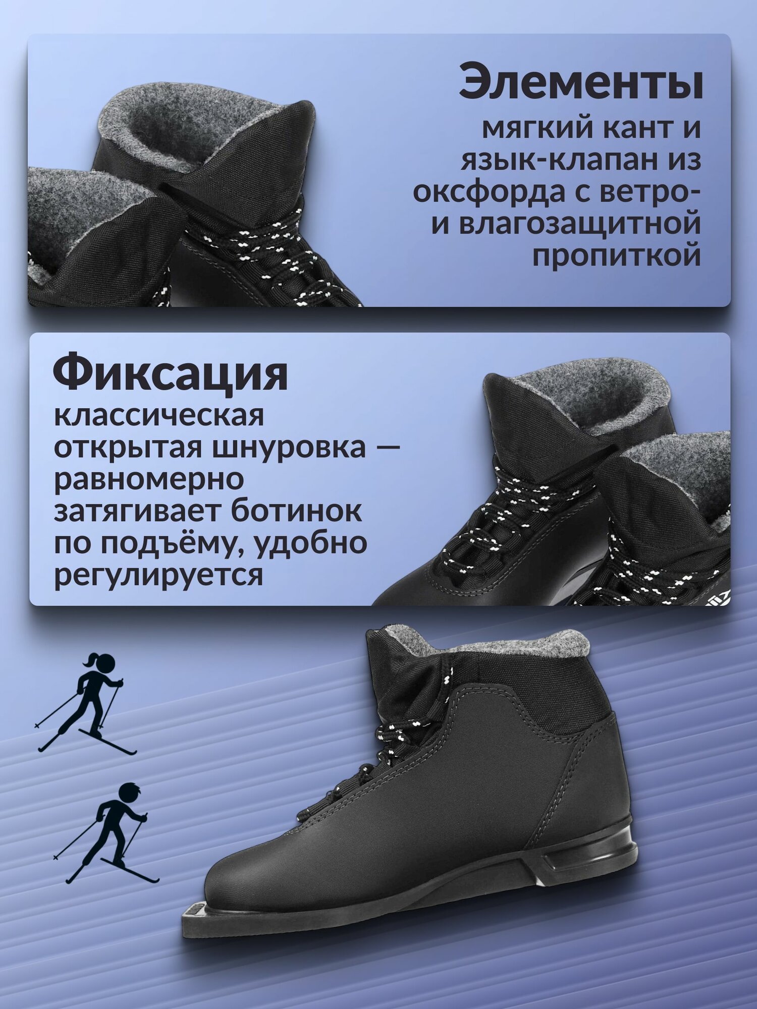 Лыжные ботинки TREK Skiing IK1 75 мм — надежная модель начального уровня, идеально подходящая для классического хода и спокойных прогулок всей семье. Благодаря системе крепления 75 мм , ботинки лыжные обеспечивают устойчивость и контроль на трассе. Модель оснащена открытой шнуровкой, которая позволяет легко регулировать жесткость стопы в ботинке для лыж. Мягкий кант и язык из ткани Оксфорд с ветро- и влагозащитной пропиткой защищают ноги от снега и холода. Термопластичный носок способствует сохранению формы ботинка и повышает его жесткость, а подформованный задник улучшает управляемость и стабильность при катании. Верх выполнен из прочной морозостойкой искусственной кожи толщиной 2,7 мм , что обеспечивает защиту в условиях низких температур. Внутри ботинка расположен теплый байковый утеплитель , который помогает сохранить комфорт даже при морозах до –30°C. Система стелек включает: - основная стелька из кожкартона — добавляет торсионную жесткость для лучшего контроля; - вкладную утепленную стельку 4 мм — обеспечивает дополнительное тепло и комфорт при катании. Подошва изготовлена из высокотехнологичного термоэластопласта, выдерживает морозы и механические нагрузки. Преимущества модели TREK Skiing IK1 - Подходят для начинающих лыжников - Совместимость с системой крепления 75 мм - Теплые и комфортные даже при –30 °C - Ветро- и влагозащитный язык Oxford - Прочный морозостойкий верх 2,7 мм. - Улучшенный контроль благодаря термопластическому заднику - Удобная анатомическая колодка средней полноты Лыжные ботинки TREK Skiing IK1 — это практичное, теплое и комфортное решение для классических прогулок и зимних прогулок. Они обеспечивают надежную фиксацию, защиту от холода и содержание, что делает их предпочтительным выбором для семейного отдыха и катания любительского уровня.