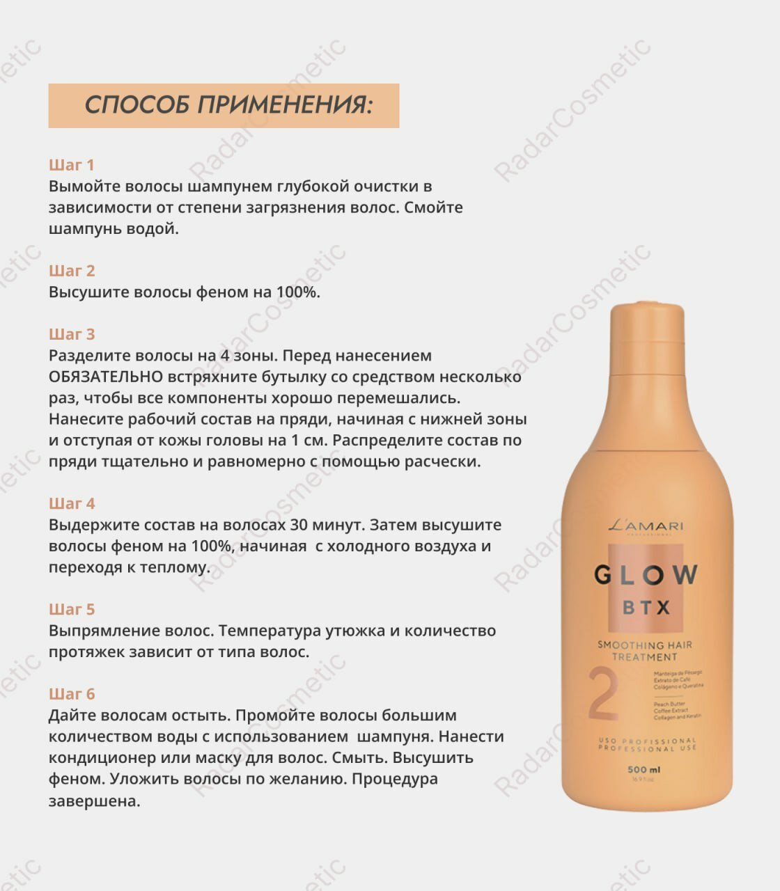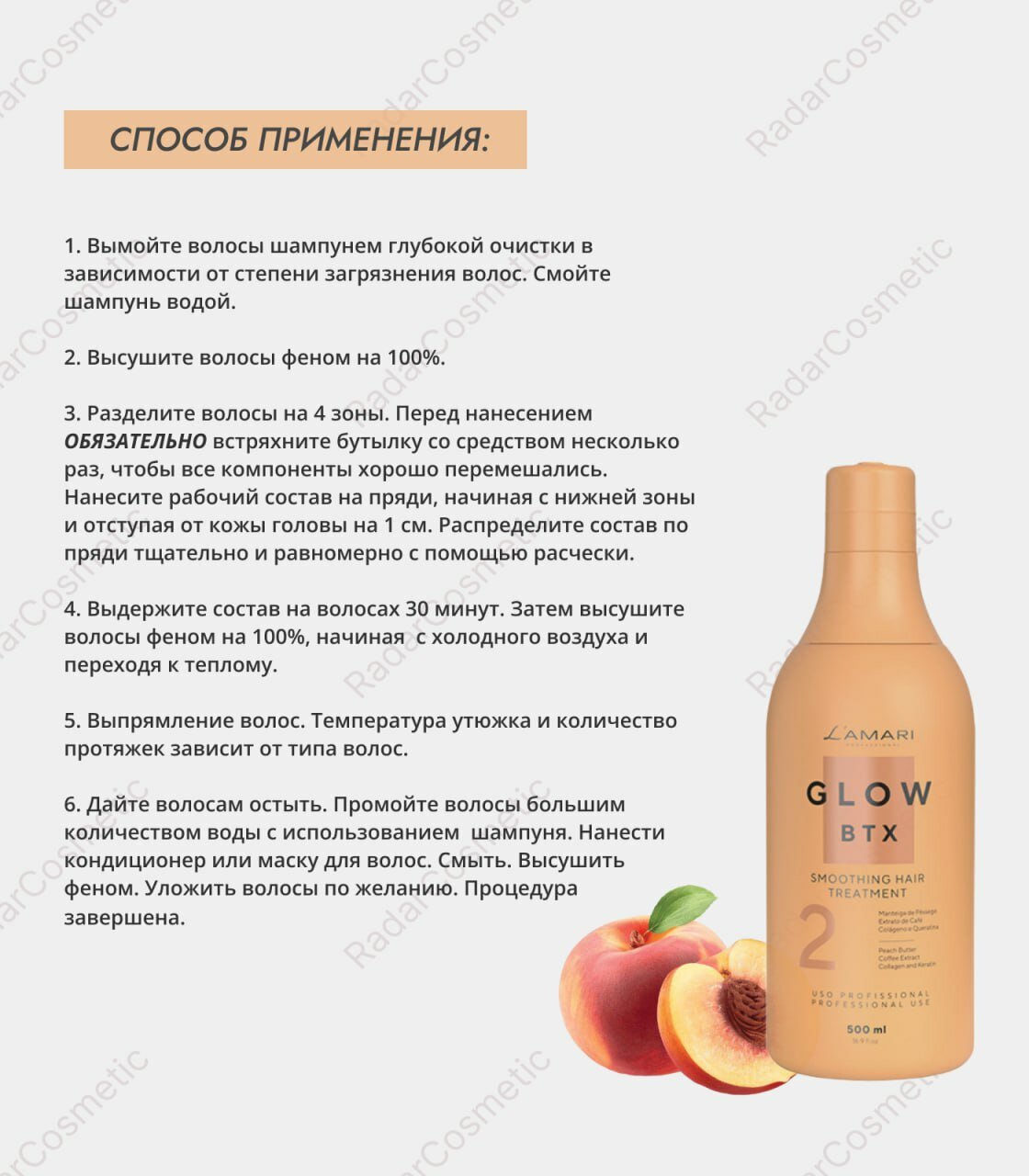 В состав Glow BTX входят ценные компоненты, такие как персиковое масло, коллаген, цистеин, аминокислоты и протеины. Эти активные ингредиенты активно работают над укреплением и уплотнением волокон волос, восстанавливая их структуру и придавая здоровый вид, сияние и эластичность.