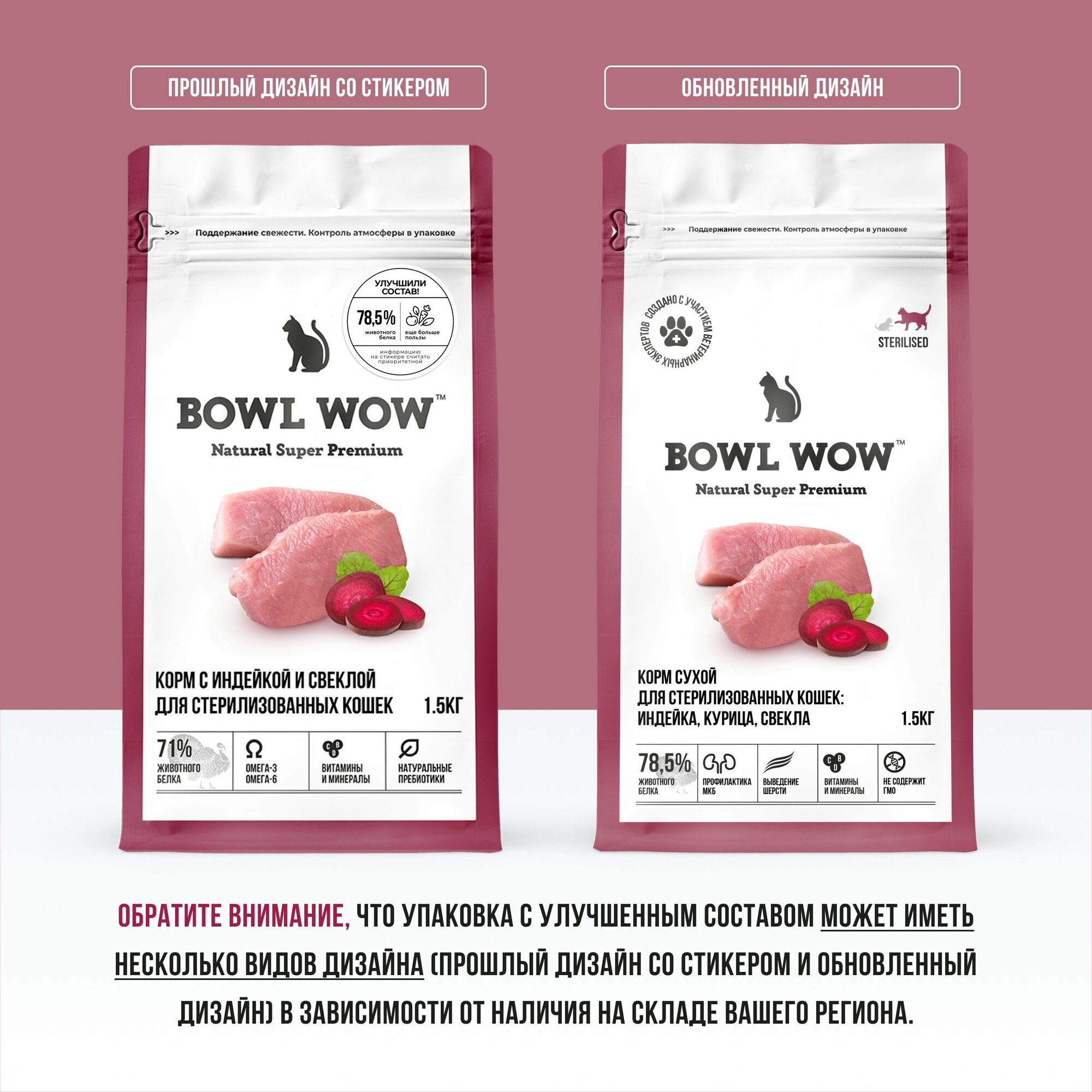 Купить Корм сухой Bowl Wow NATURAL SUPER PREMIUM STERILISED для стерилизованных кошек индейка, курица, свекла, 1,5 кг с доставкой по всей России. Корм сухой Bowl Wow NATURAL SUPER PREMIUM STERILISED для стерилизованных кошек индейка, курица, свекла, 1,5 кг: сравнение цен, характеристики, фото, актуальное наличие и цены.