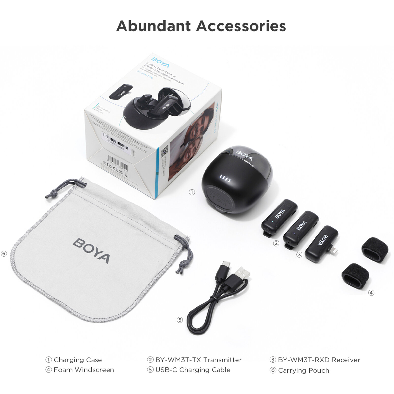 BOYA BY-WM3T-D2 Беспроводная Микрофонная Система с 1 Приемником + 2 Передатчиками + Зарядным Классом Дальность Передачи 100М Время Работы 10ч Встроенная Аккумуляторная батарея Для iPhone Для Live Трансмиссия 2.4GHz Полярная Диаграмма Всесторонняя Антенна