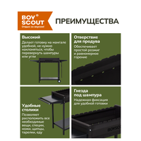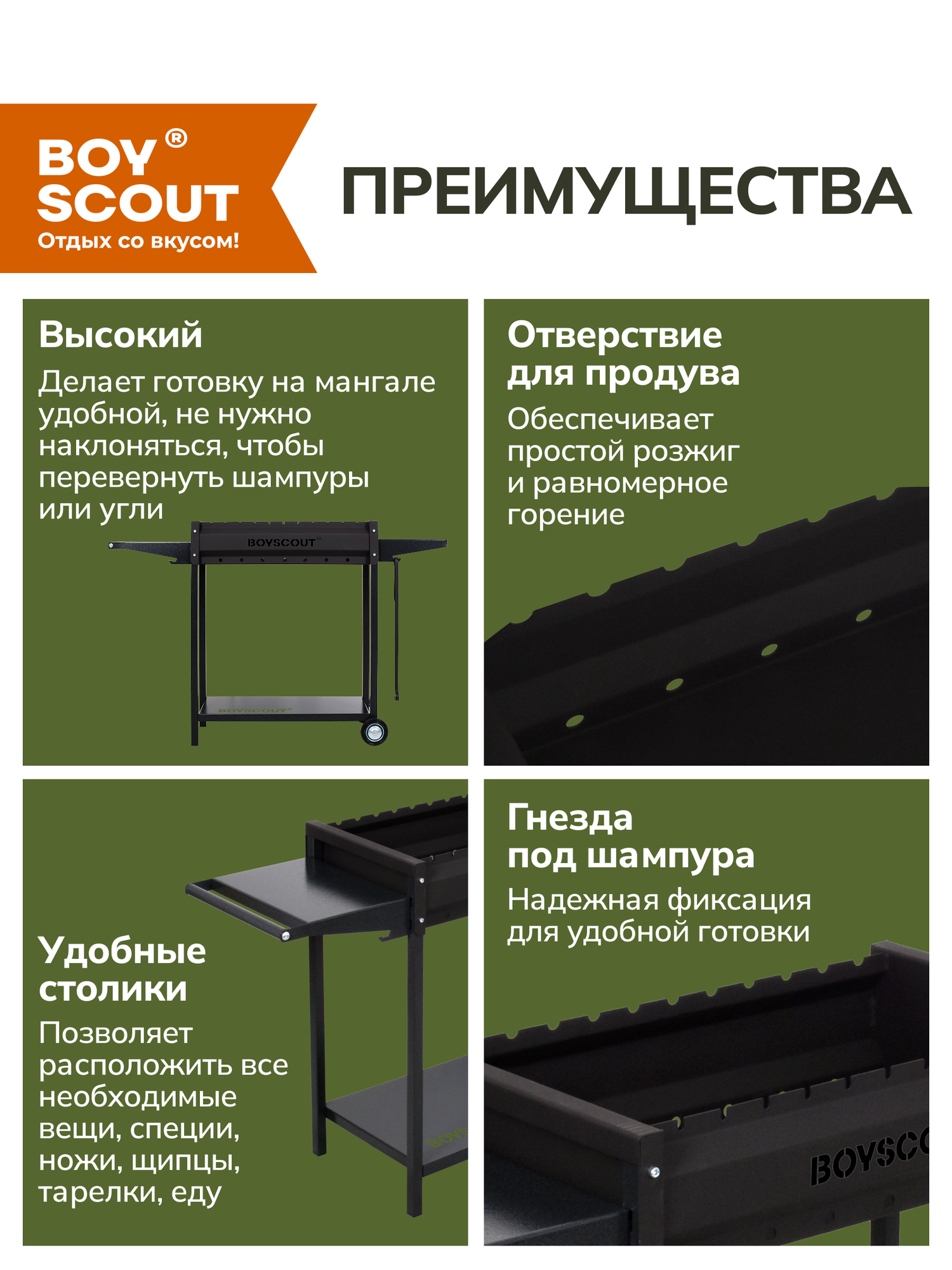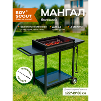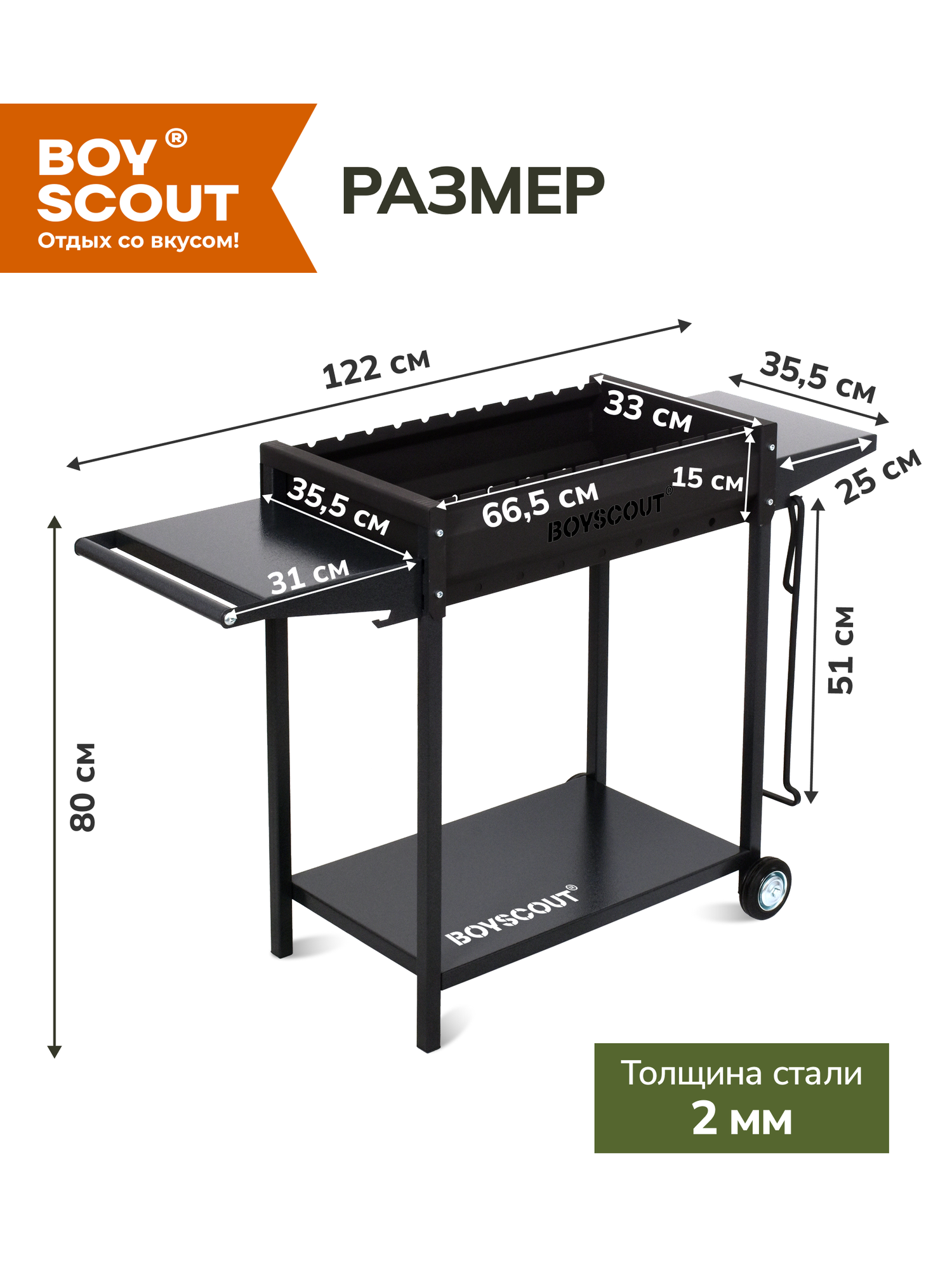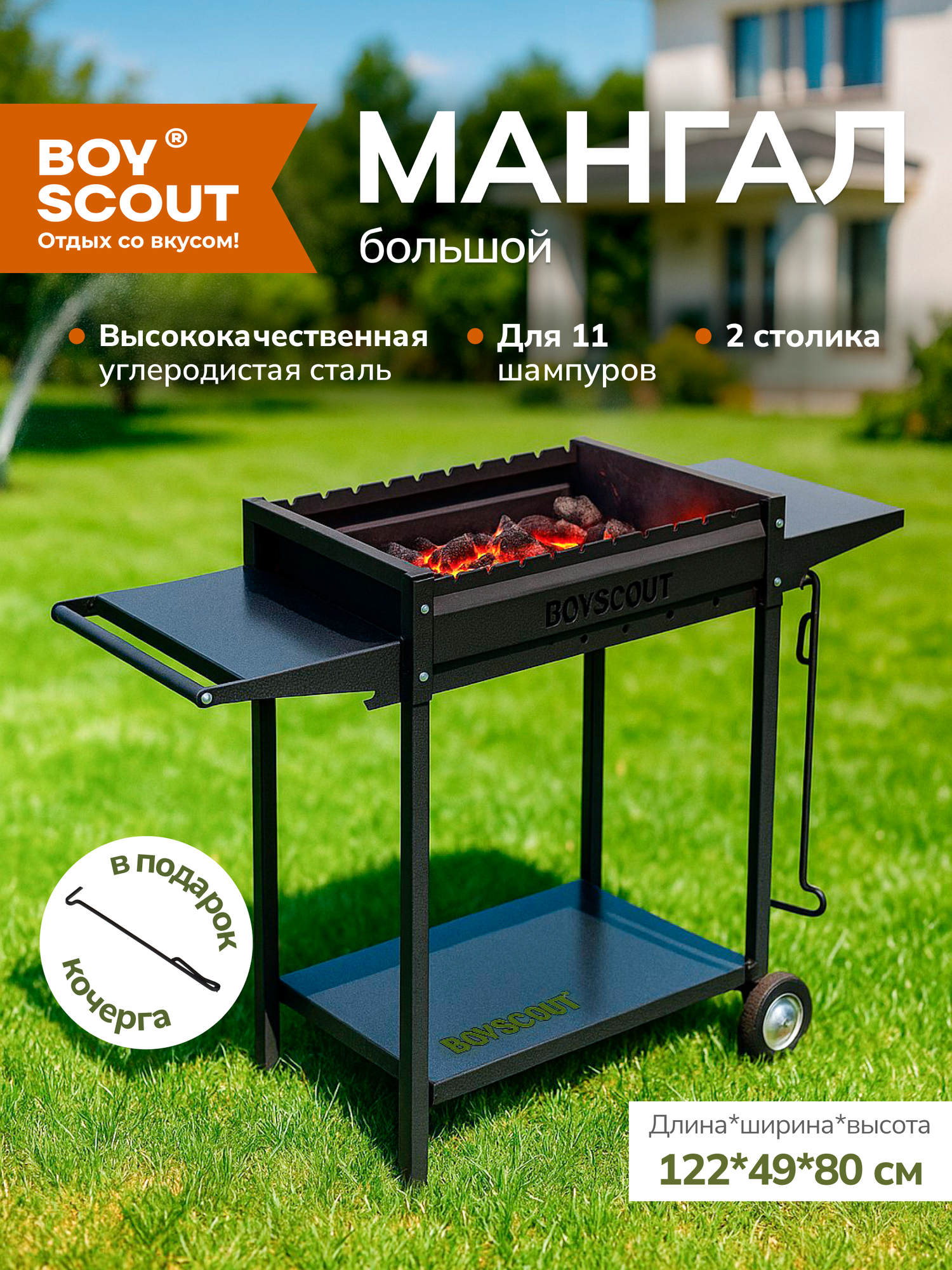 BOYSCOUT Мангал 1220x490x800 мм с 2-мя столиками, дровницей и кочергой на колесах, сталь 2 мм.: сравнение цен, характеристики, фото, актуальное наличие и цены.