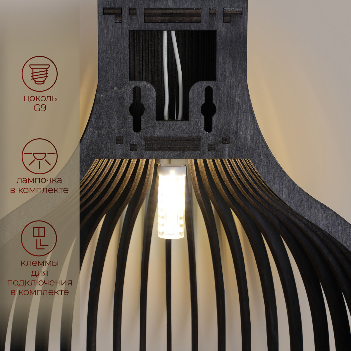 Деревянный светильник; патрон G9; крепеж; клеммы; упаковка; гарантийная карточка