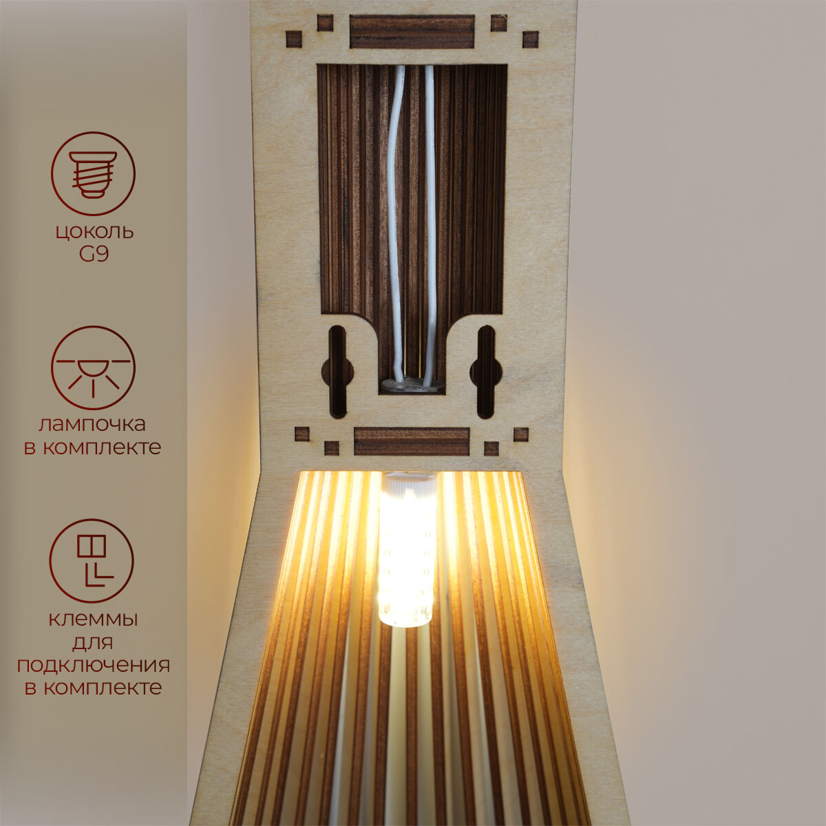 | Подробная комплектация | Деревянный светильник; патрон G9; крепеж; клеммы; упаковка; гарантийная карточка |
