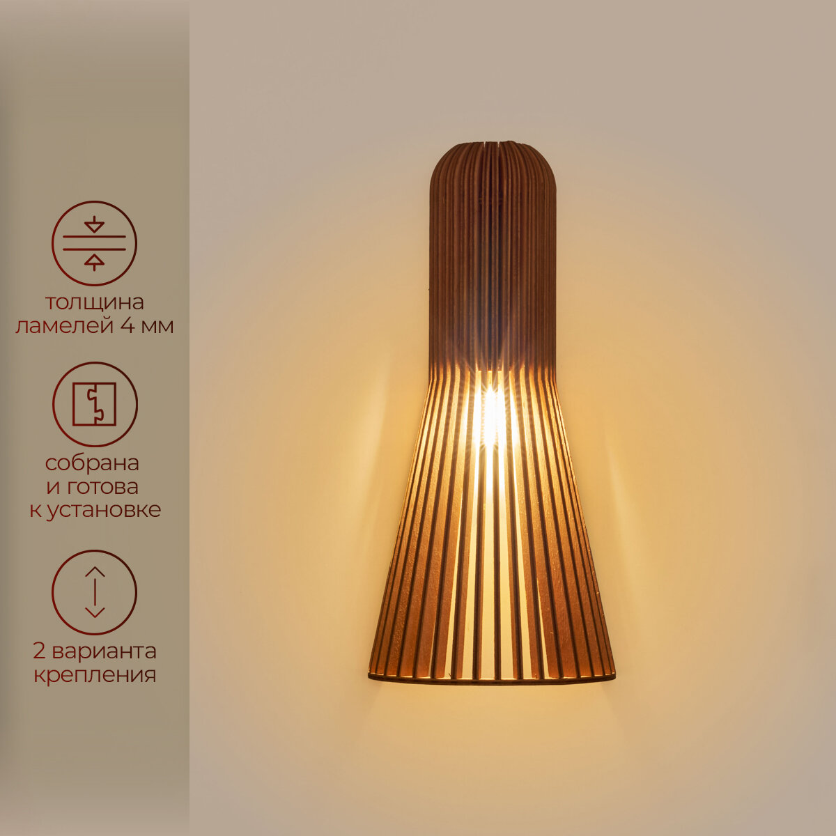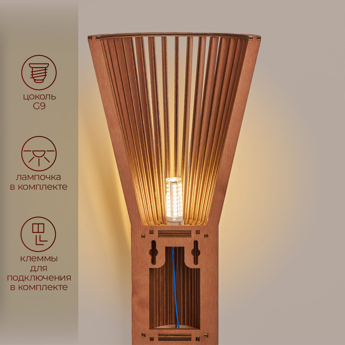 | Подробная комплектация | Деревянный светильник; патрон G9; крепеж; клеммы; упаковка; гарантийная карточка |