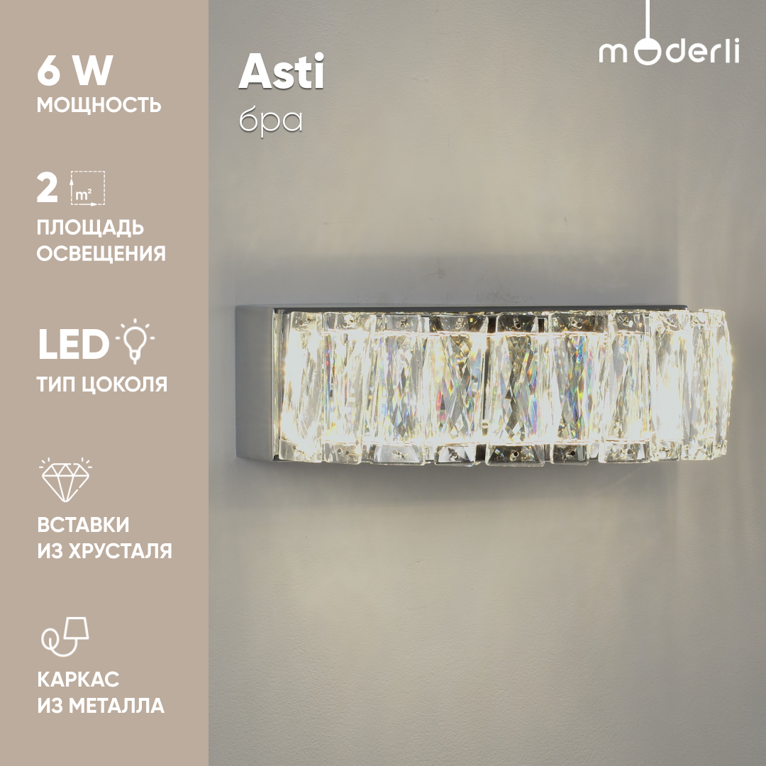 Настенный светильник светодиодный бра Asti в современном стиле. Хрустальные элементы настенного светодиодного бра дают мягкий атмосферный свет и создают на стенах и потолке красивую игру света и тени, где бы вы их ни включили. Один настенный светильник равномерно освещает площадь 2 кв. м. Мощность бра хрустального настенного составляет 6 Вт. Сенсорная панель в основании светильника хрустального позволяет регулировать температура освещения одним прикосновением.