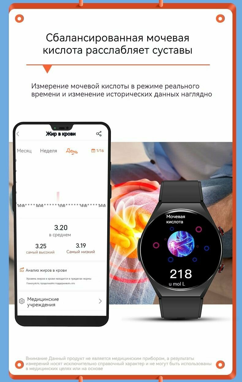 Преимущества➤ 1,32-дюймовый 360*360 HD сенсорный экран с нижним корпусом из медицинской стали 316➤ Неинвазивное определение уровня глюкозы в крови➤ ЭКГ-тестирование для скрининга заболеваний, отслеживание ВСР и отчет об анализе рассеяния Лоренца можно просмотреть на APP для полного понимания.➤ 24-часовой мониторинг частоты сердечных сокращений, измерение артериального давления, содержания кислорода в крови и температуры тела, мониторинг сна.➤ поддерживаемых спортивных режимов (ходьба в помещении, бег в помещении, ходьба на улице, бег на улице, пешие прогулки, степпер, велотренажер), учет шагов, калорий и расстояния.➤ Настраиваемый циферблат часов с массивным рынком циферблатов для ваших предпочтений. Дистанционное управление: добавьте родителей или друзей в друзья в приложении, и вы сможете удаленно просматривать ежедневный пробег, калории, время сна, измеренный пульс, артериальное давление и другие данные о состоянии здоровья друг друга. Основные функцииНеинвазивное определение уровня глюкозы в крови, мониторинг ЭКГ, анализ ЭКГ в реальном времени с помощью нагрудного пластыря, мониторинг артериального давления, мониторинг кислорода в крови, мониторинг температуры тела, мониторинг сна, женский физиологический цикл, дыхательная тренировка, режим мультитренировки, пользовательский набор, онлайн-мультизвонок, запись упражнений, напоминание о звонках и сообщениях, push-сообщения, сверхнизкое энергопотребление и длительный срок службы, беззвучный будильник, дистанционное фото, управление музыкой, напоминание о сидячем образе жизни, напоминание о необходимости пить воду, отображение погоды, обратный отсчет, встряска для съемки, поиск мобильного телефона, секундомер, таймер, расчет. App● Поддержка Android 4.4 и IOS 8.2 выше версии