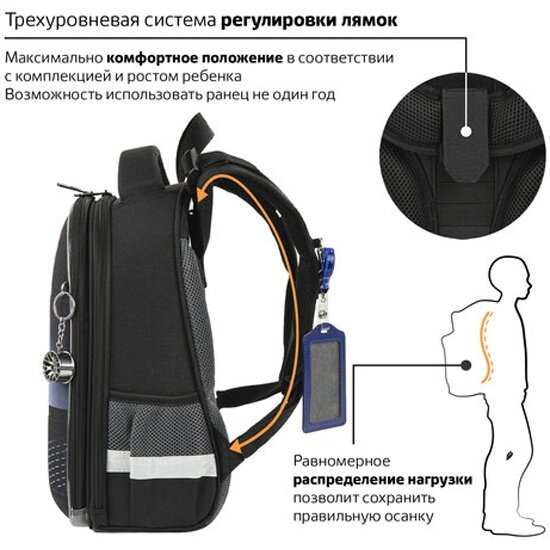 Удобная мягкая вентилируемая спинка с воздушными спонжевыми панелями разработана с учетом анатомических особенностей детей младшего школьного возраста. При правильной регулировке ранец будет практически не ощущаться на плечах и не будет доставлять дискомфорт при носке. В процессе эксплуатации равномерное распределение нагрузки позволит сохранить правильную осанку!