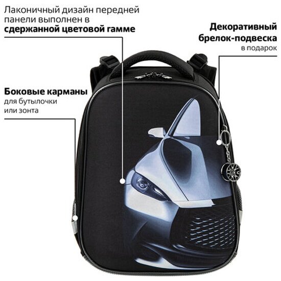 Лаконичный дизайн передней панели выполнен в сдержанной цветовой гамме. В сочетании с оригинальным брелком-подвеской, который дополняет тематику изображения, ранец выглядит очень стильно.