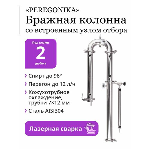 Бражная колонна «PEREGONIKA» 2 дюйма со встроенным узлом отбора по жидкости, кожухотрубное охлаждение, трубки 7×12 мм