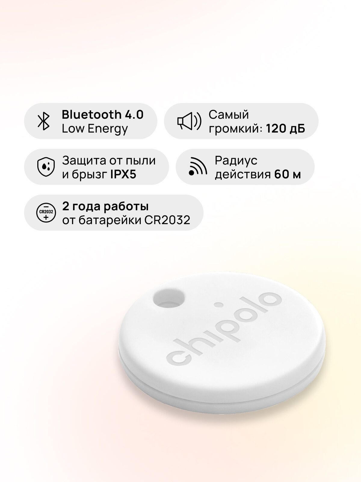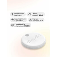 питание от заменяемой батарейки CR 2032; защита от брызг воды стандарта IPX5; громкость звукового оповещения 120 дБ; с уведомлениями о забытых вещах; с голосовым управлением Siri, Alexa, Assistant; радиус действия — до 60 м