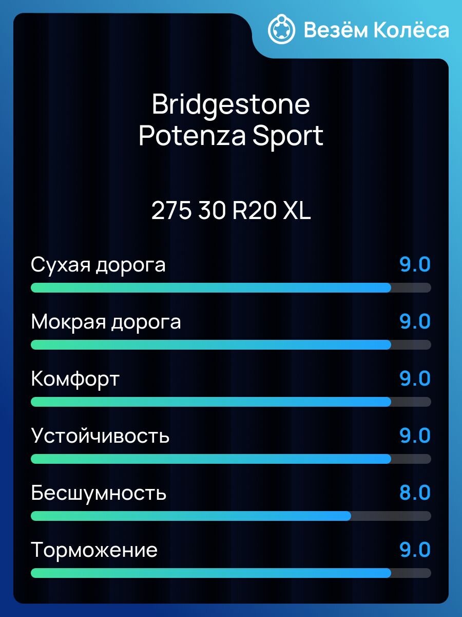 * На основании испытаний, проведенных TÜV SÜD по запросу Bridgestone в июле-сентябре 2020 года на объектах Bridgestone EUPG (Италия), где тесты на сухом и мокром покрытии были проведены на автомобиле Audi S4 3.0 TFSI с шинами типоразмера 245/40 R18. Было проведено сравнение Potenza Sport с характеристиками основных конкурентов в том же сегменте: Continental Premium Contact6, Michelin Pilot Sport 4, Goodyear Eagle F1 Asymmetric 5, Pirelli P Zero PZ4. Приложение Отчет № [713190691 PS].