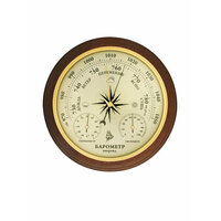 Метеостанция механическая бриг КМ91420ТГБ-О . Эта бытовая метеостанция измеряет температуру, атмосферное давление и относительную влажность окружающего воздуха. Выполнена из массива благородной древесины бука в цвете орех, позволяющем сочетать ее с любым интерьером. Установленные приборы: барометр анероид, измеряемое давление от 720 до 800 мм. рт. ст.(960 - 1070 гПа). Термометр-диапазон измерения температуры от минус 25 до плюс 50 градусов цельсия. Гигрометр - диапазон измерения относительной влажности в помещении: 0 - 100 % rH. Размеры механизм барометр D180 мм со встроенным гигрометром и термометром, корпус(круг, размер ф240 мм, массив бука, цвет - орех) .