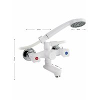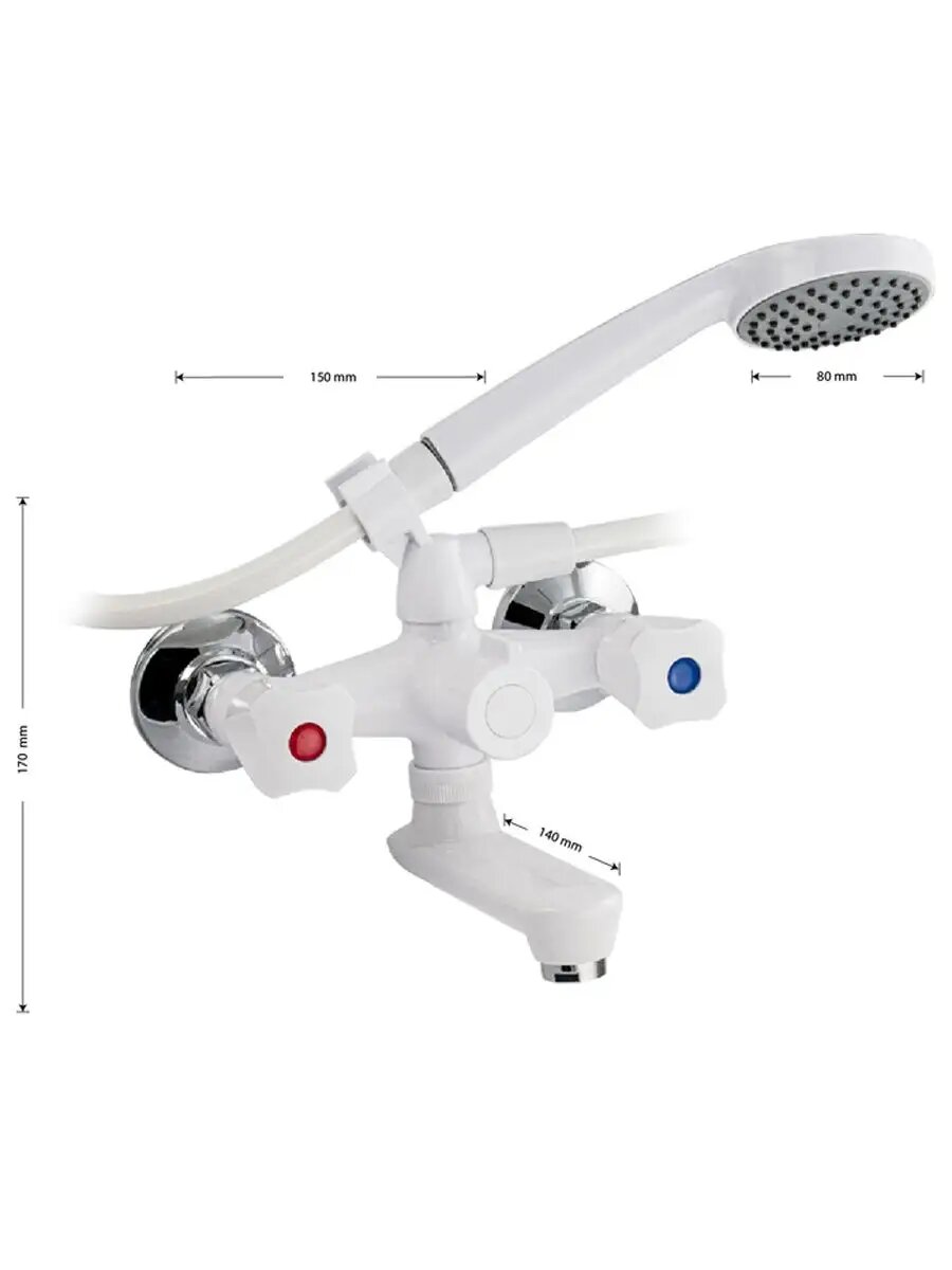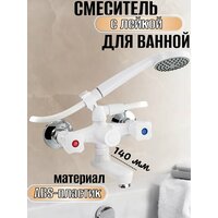 Смеситель из высокопрочного пластика АБС - белый, в ванную/душевую комнату, с коротким, плоским, поворотным изливом, литой корпус, металлокерамика с дивертором м/к на корпусе. Материал изготовления — пластик. Кранбуксы металлокерамика 1/2, ручки ромб поворот на 90˚, аэратор для экономии воды, чашки и эксцентрики. Габаритные размеры: ширина 150 мм, высота корпуса 170 мм, длина излива 140 мм, душевая лейка d = 80 мм, шланг 150 см, диаметр чашки 65 мм. Вес - 1,000 кг, объём - 0,00550 м3. В комплекте паспорт, корпус с изливом, дивертор, душевая лейка, шланг, кронштейн, комплект крепежа и прокладок.
