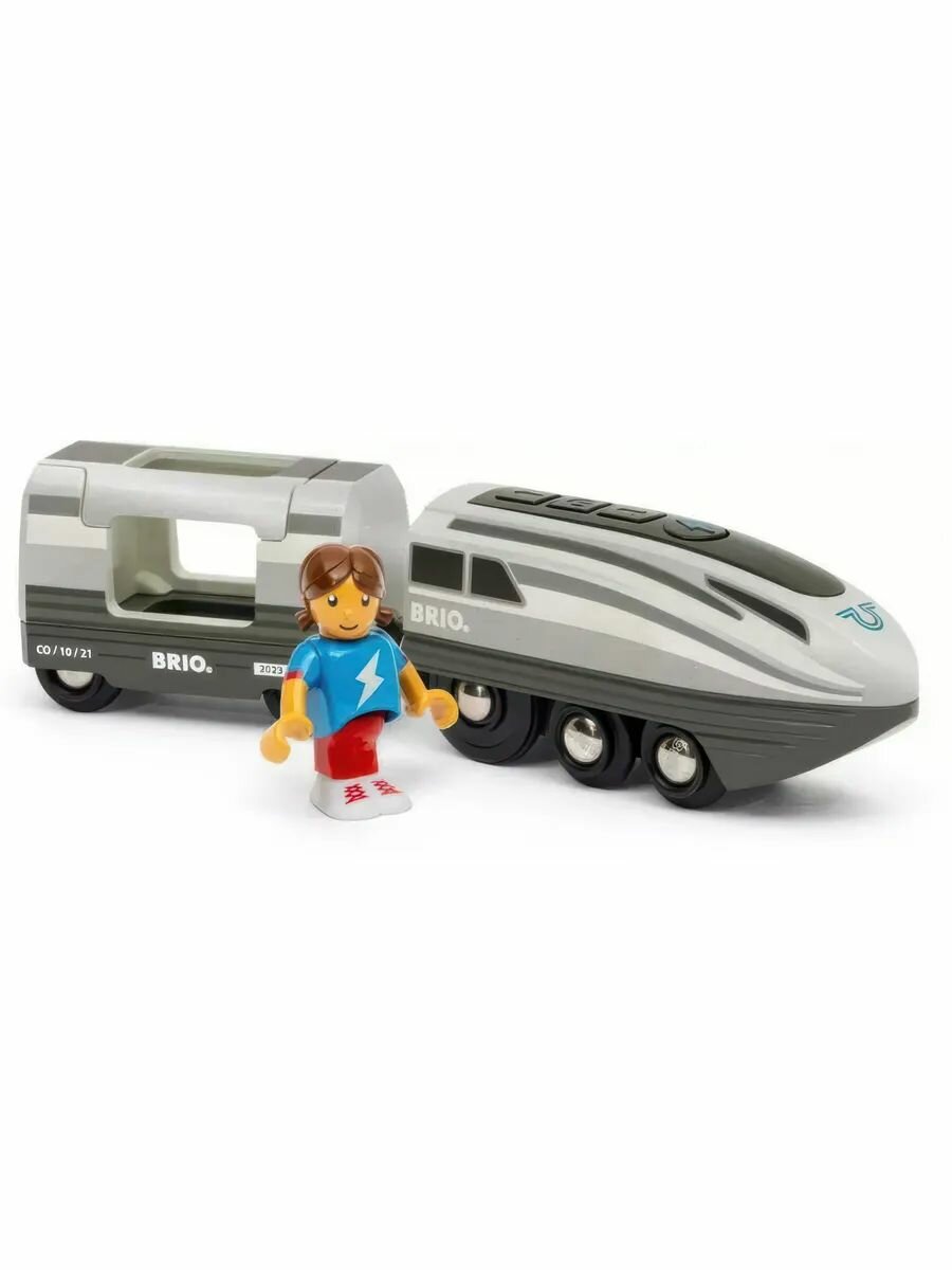 И путешествие продолжается! Увеличьте скорость своего поезда с помощью Турбопоезда 36003. Когда вы нажимаете большую турбо-кнопку, этот игрушечный поезд с батарейным питанием движется в два раза быстрее, что делает его самым быстрым поездом на железной дороге BRIO World. Турбо мощность длится пять секунд. Когда поезд мчится на максимальной скорости, белый свет по бокам локомотива меняется на холодный синий. Помимо локомотива, в этом футуристично спроектированном поезде есть пассажирский вагон, в котором один счастливый пассажир получает возможность насладиться головокружительной поездкой на поезде.Не включает батареи (2xAA).Возрастная рекомендация: старше 3 лет.
