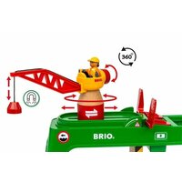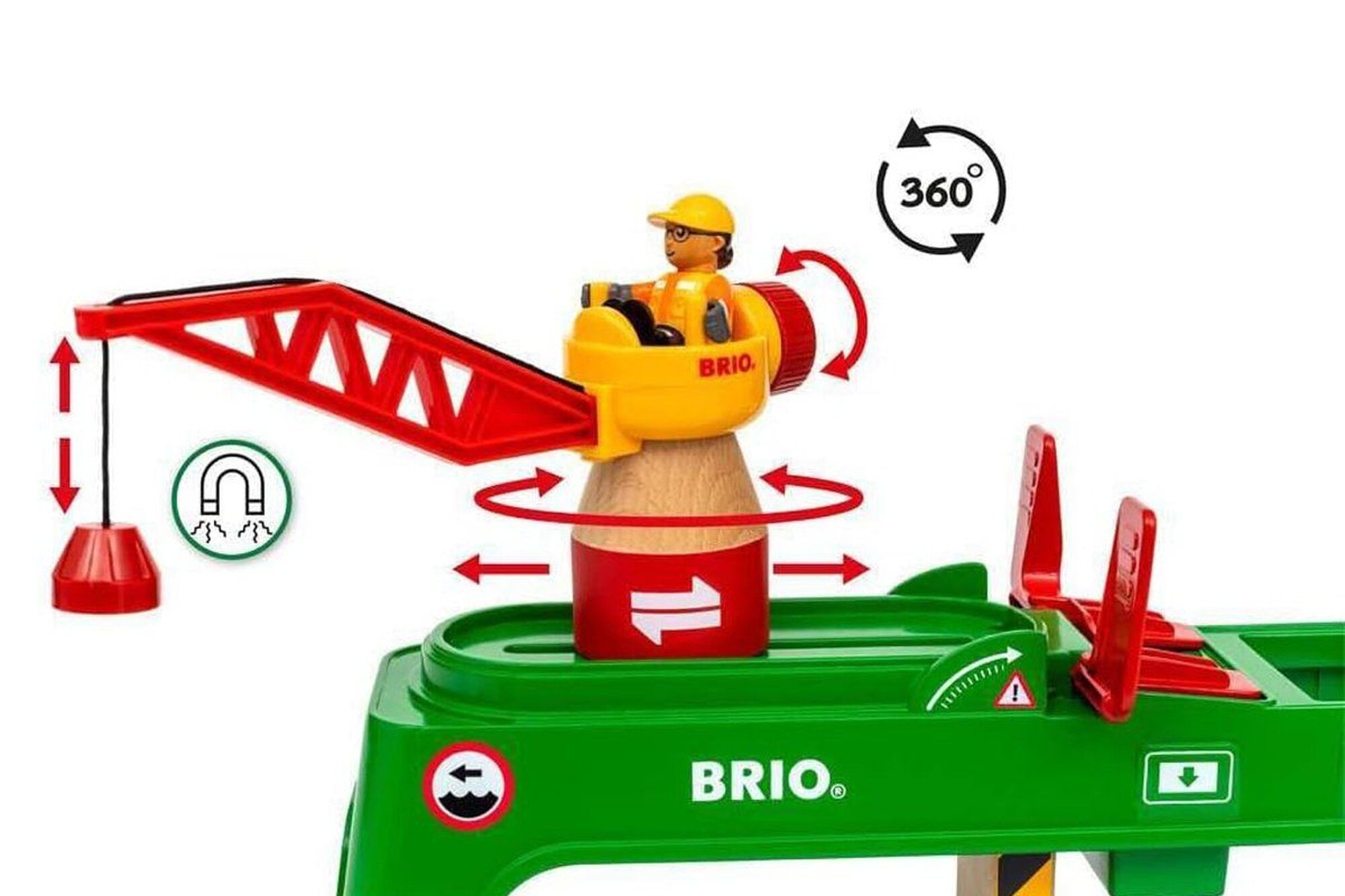 Захватите доки Brio World с помощью фантастического крана. С помощью контейнерного крана 33996 вы можете перемещать все тяжелые контейнеры в доке BRIO World. Возьмите контейнер с помощью магнитного крючка, поверните и сдвиньте большой кран на место над гусеницей. Опустите деревянный груз на место с помощью лебедки и закройте его красной крышкой, прежде чем он точно упадет в ожидающий внизу вагон!