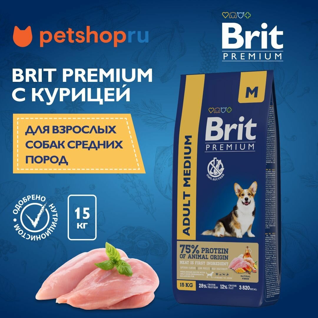Brit Premium Dog Adult Medium. Полнорационный сухой корм премиум класса с курицей для взрослых собак средних пород (10–25 кг). Состав: дегидрированное мясо 30%, в том числе мясо курица 14%, пшеница, кукуруза, жир куриный, глютен кукурузный, мясной соус 2 %, сушеное яблоко, дрожжи (источник маннанолигосахаридов), витаминно-минеральный комплекс, топинамбур (инулин - источник фруктоолигосахаридов), клюква, антиокислитель, экстракт юкки Шидигера, экстракт розмарина. Пищевая ценность на 100 г (средние значения): белок 28 г, жир 12 г, клетчатка 1,4 г, зола 6,5 г, Са 1,8 г, P 1,0 г, К 0,6 г, FE 22 мг, ZN 14 мг, I 0,2 мг. Питательные добавки на 1 кг: Витамин А 15000 МЕ, Витамин Д3 900 МЕ, Витамин Е 300 мг/кг, витамин B1 (тиамин) 2,7 мг, витамин B2 (рибофлавин) 7,2 мг, витамин B6 (пиридоксин) 2,1 мг, витамин B12 (кобаламин) 0,04 мг, ниацин (никотиновая к-та /витамин РР / В3) 15 мг, пантотеновая к-та (витамин В5) 6 мг, фолиевая к-та (витамин В9) 3 мг, холин (витамин В4) 900 мг, биотин 0,36 мг, кальций (Са) 0,3 г, железо (Fe) 43,5 мг, медь (Cu) 8,88 мг, марганец (Mn) 21,3 мг, цинк (Zn) 15 мг, йод (I) 0,39 мг, селен органический (Se) 0,09 мгСодержит: Омега-3 жирные кислоты, Омега-6 жирные кислоты. Энергетическая ценность на 1 кг: 3820 ккал / 15994 кДж. Произведено в России.