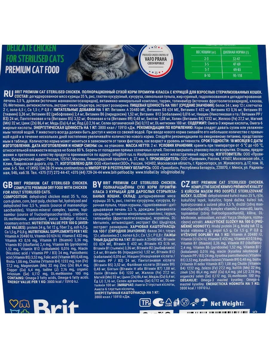 | Дозировка | вес кошки 2-3кг - 30-46 г. день вес кошки 3-5 кг -46-67 г. день вес кошки 5-7 кг - 67-80 г. день вес кошки 8-10 кг - 91-114 г. день |