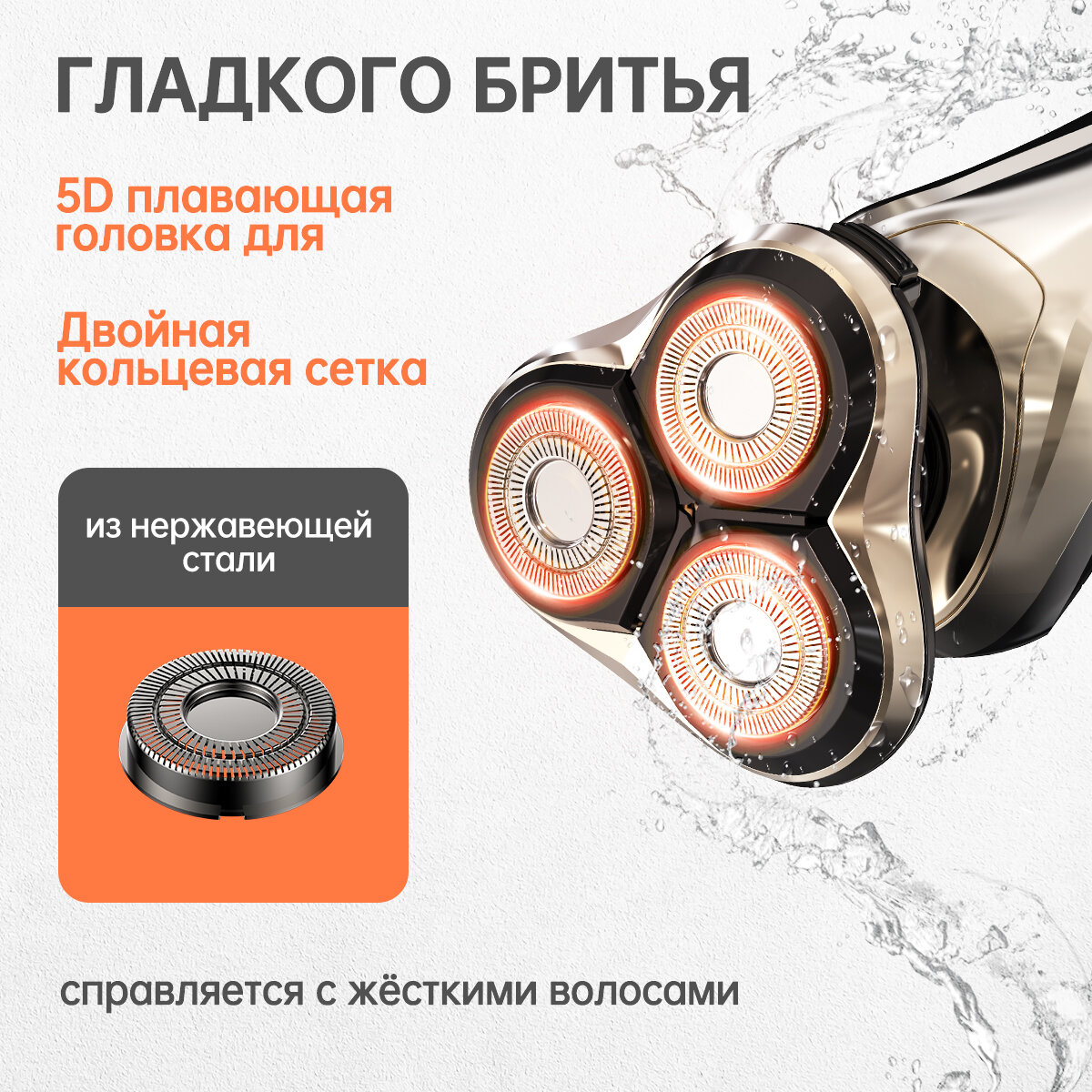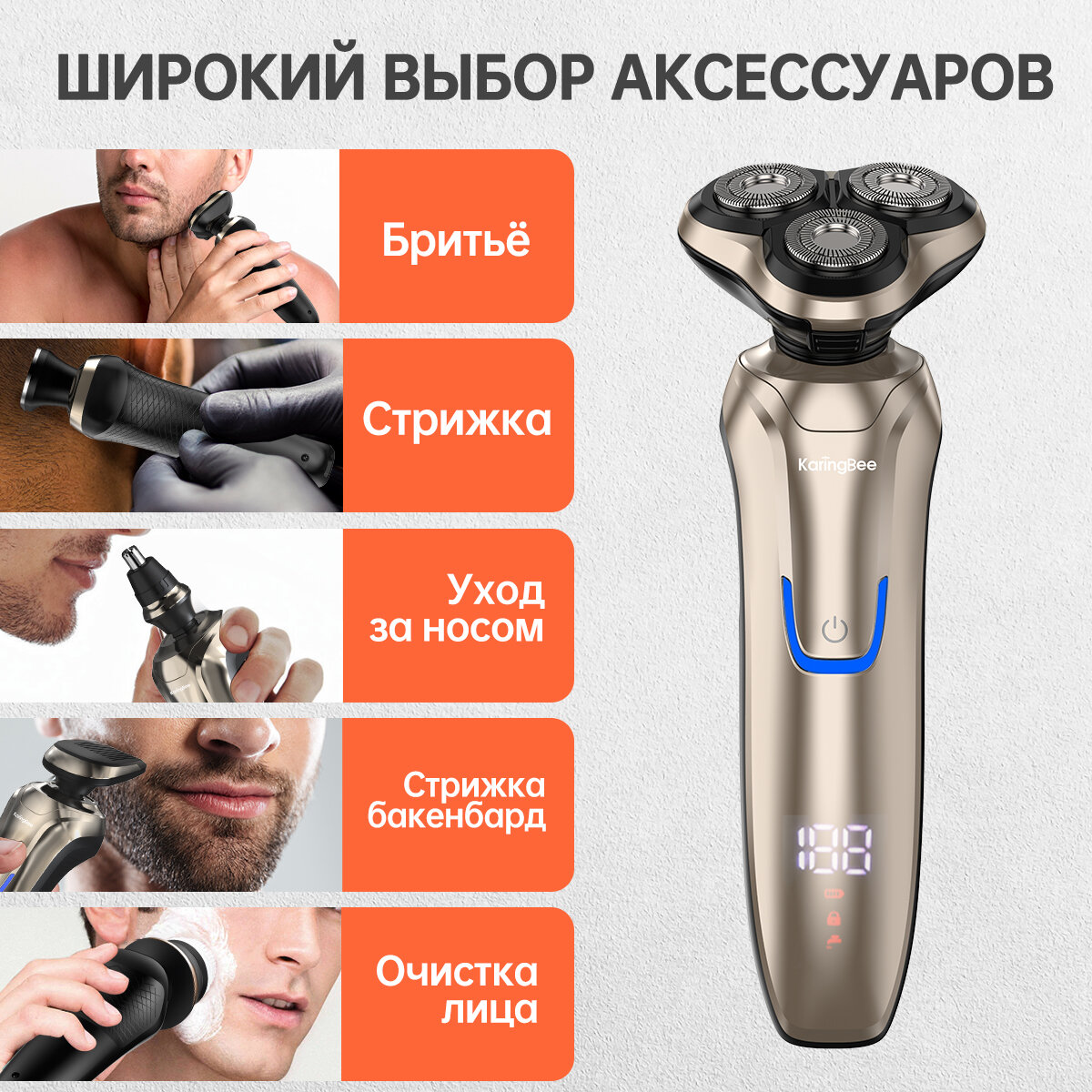 Электробритва Karingbee - это многофункциональное устройство, которое позволяет выполнять все необходимые процедуры по уходу за волосами на лице. Она оснащена 4D-режущей головкой, триммером для усов, бакенбард и бороды, выдвижной насадкой для удаления волос из носа и ушей, а также щеткой для глубокой очистки пор лица от пыли и грязи.