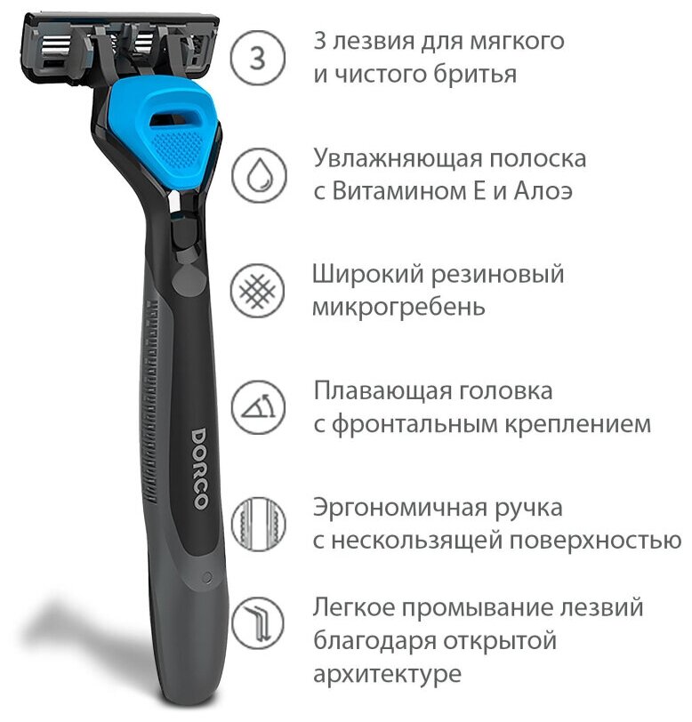 Dorco Бритва Cross3, 3-лезвийная, крепление Cross, плавающая головка, увлажняющая полоса (1 станок, 5 кассет). Бритвенный станок Dorco Cross3 совместим только со сменными кассетами Dorco Cross3. В упаковке 1 бритвенный станок и 5 сменных кассет. - Три лезвия обеспечивают идеальное и чистое бритье. - Лезвия легко промываются благодаря открытой архитектуре обратной стороны бреющей головки. - Плавающая головка с фронтальным креплением ведет лезвие по контурам лица, обеспечивая гладкое и чистое бритье. - Эргономичная ручка с нескользящей поверхностью позволяет легко удерживать станок.