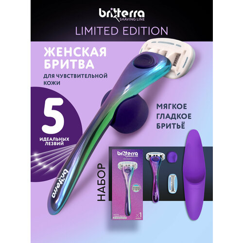 Женский набор для бритья BRITTERRA FOR WOMEN Colorful Space SET 5 лезвий со сменными насадками безопасен для кожи и позволяет добиться деликатного удаления нежелательных волос. Набор включает в себя: силиконовый чехол для бритвы, бритвенная ручка, сменная кассета для бритья с 5 лезвиями.
