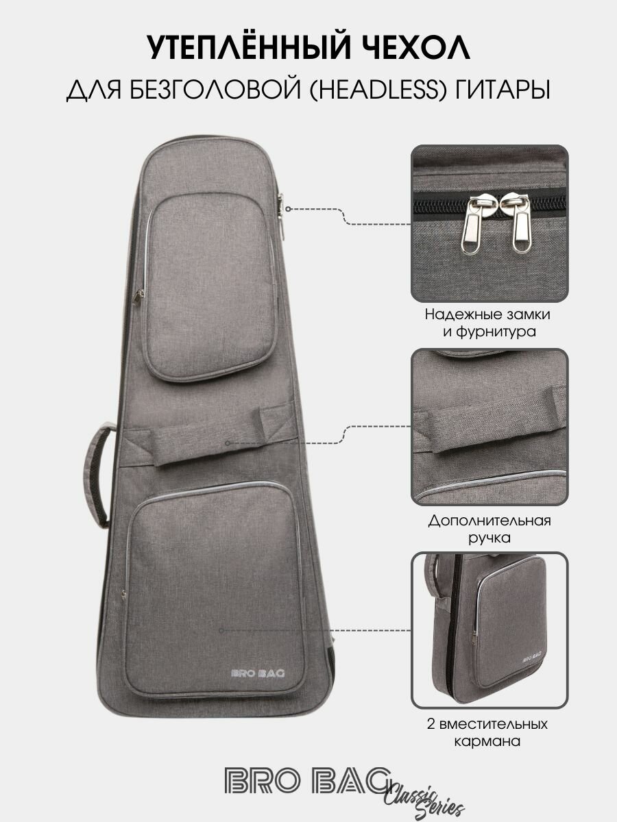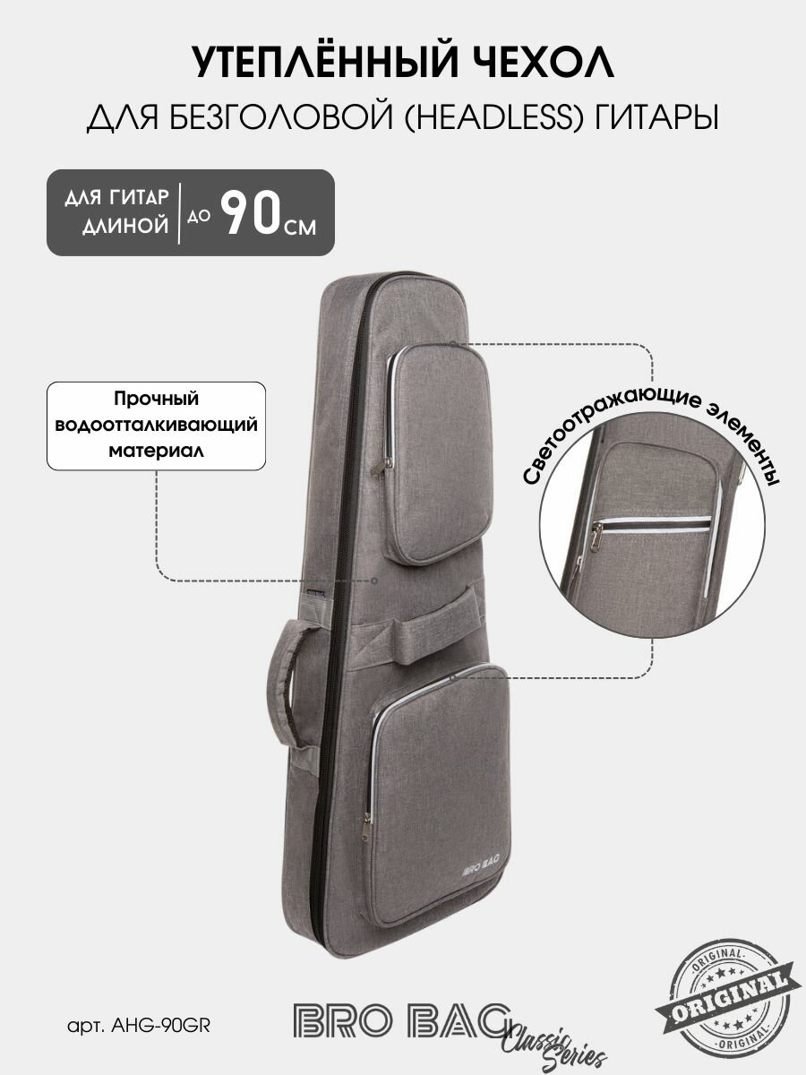 Мягкий утепленный чехол из плотного влагозащитного материала. Подойдет для безголовой (headless) электрогитары длиной до 90 см.
