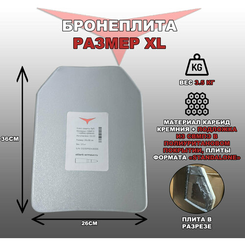 Класс защиты соответствует Бр5; Материал: карбид кремния + подложка из свмпэ (Сверхвысокомолекулярный полиэтилен высокой плотности) - плиты standalone (используются без антирикоштного пакета); Толщина 30мм Размеры XL 260*360 мм; Вес плиты 3,5 кг. Имеет один изгиб по плоскости; Гарантия 5 лет; Принцип работы керамики заключается в том, что внутри плиты находится множество небольших пластинок из карбида кремния. При попадании пластинка крошится и гасит энергию пули. Остатки пули и осколки самой керамики принимает на себя подложка из свмпэ.