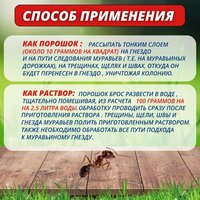 в виде порошка: порошок рассыпать тонким слоем (ок. 10 г на 1 м²) на гнездо и на пути следования муравьев (т.е на муравьиных дорожках), на трещинах, щелях и швах, откуда он будет перенесен в гнездо, уничтожая колонию; в виде раствора: порошок развести в воде, тщательно помешивая, из расчета 100 г на 2,5 л воды, обработку проводить сразу после приготовления раствора; трещины, щели, швы и гнезда муравьев полить приготовленным раствором; также необходимо обработать все пути подхода к муравьиному гнезду; не обрабатывать места (пол, лестницы и т.п.) частого передвижения людей
