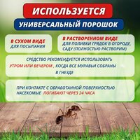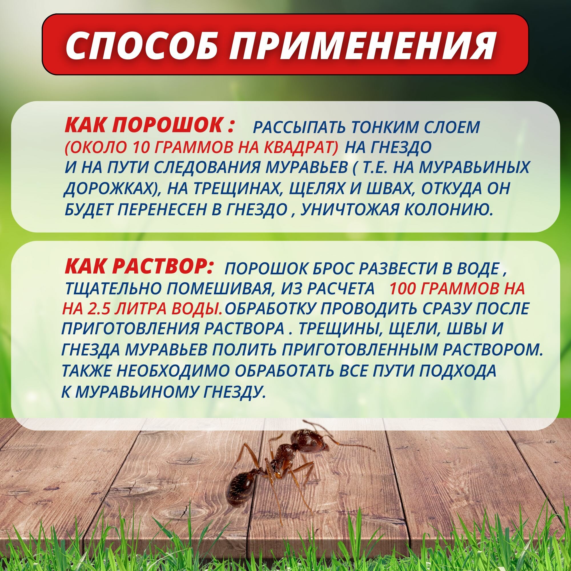Порошок Bros от садовых муравьев самый быстрый и проверенный способ избавления от данных насекомых! Лучшее средство по мнению покупателей! Порошок представляет собой уникальное сочетание кормовой приманки и ядов. Благодаря этому обеспечивается полное уничтожение муравьёв на значительной территории. Муравьи гибнут в течение 24 часов. Bros от муравьев можно применять, как внутри помещений, так и снаружи. Используется в виде порошка или как раствор для обрызгивания. 500 гр. порошка хватает на 50 муравьиных гнезд. В состав порошка входит 2% хлорпирофос, благодаря которому муравьи погибают в течение суток. Уничтожает муравьев, тем самым предотвращая появление тли в саду или огороде! Принесенная в гнездо приманка для муравьев уничтожает всю колонию и их королеву. Средство от домашних муравьев Bros - это высокоэффективная защита от насекомых в саду и в доме! Это единственная отрава от муравьев, которая не вызывает адаптацию у насекомых. Средство для муравьев домашних Bros не используется, как средство от тараканов или как палач от клопов.