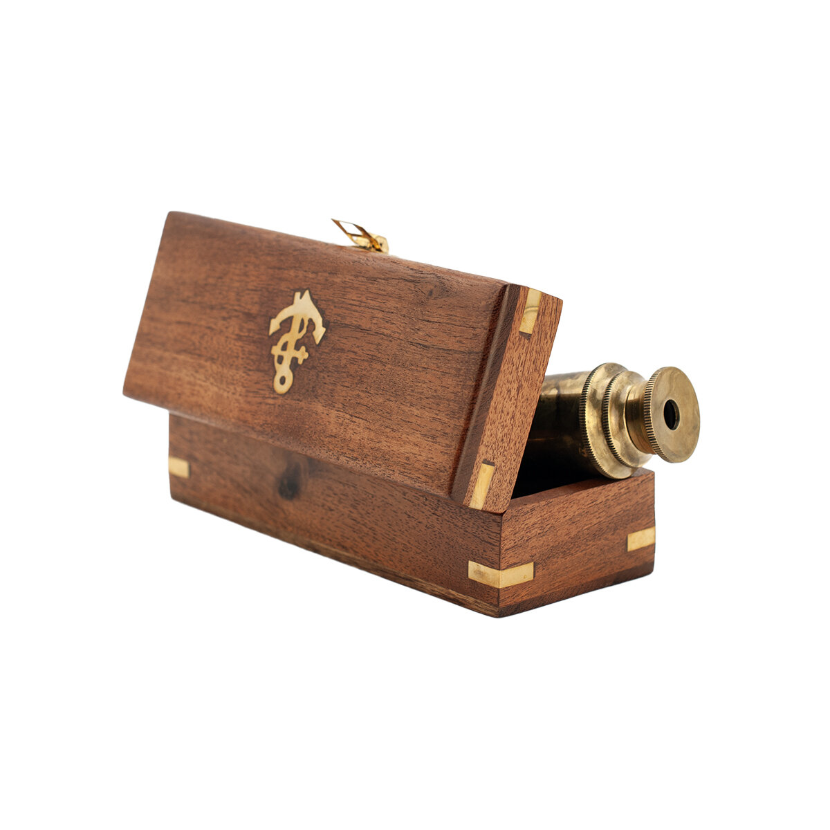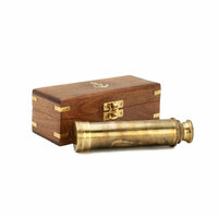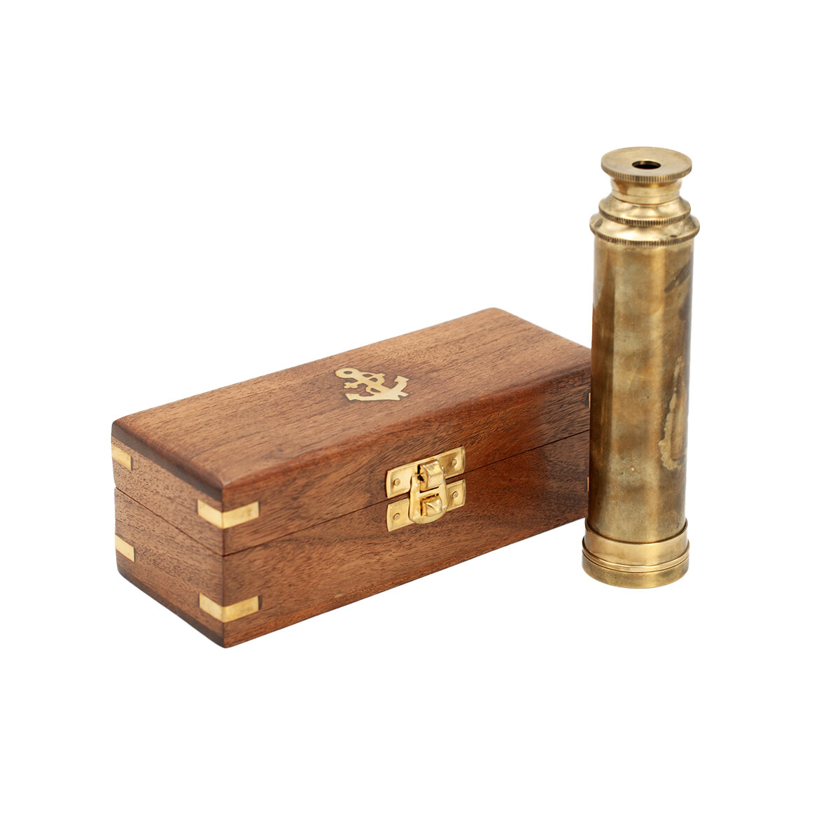 Подзорная труба брутального вида из латуни. Сувенир стилизован под трубу, которая «повидала мир, прошла огонь и воду». Необычно и стильно смотрится! Будет прекрасным украшением любой коллекции оптических приборов, а также дополнением к антуражу настоящего капитана! Деревянная шкатулка с инкрустированным якорем на крышке позволит сохранить прибор в целости и сохранности. Замечательный подарок в морском стиле! Фокус настраивается глубиной выдвижения окулярной части трубы.