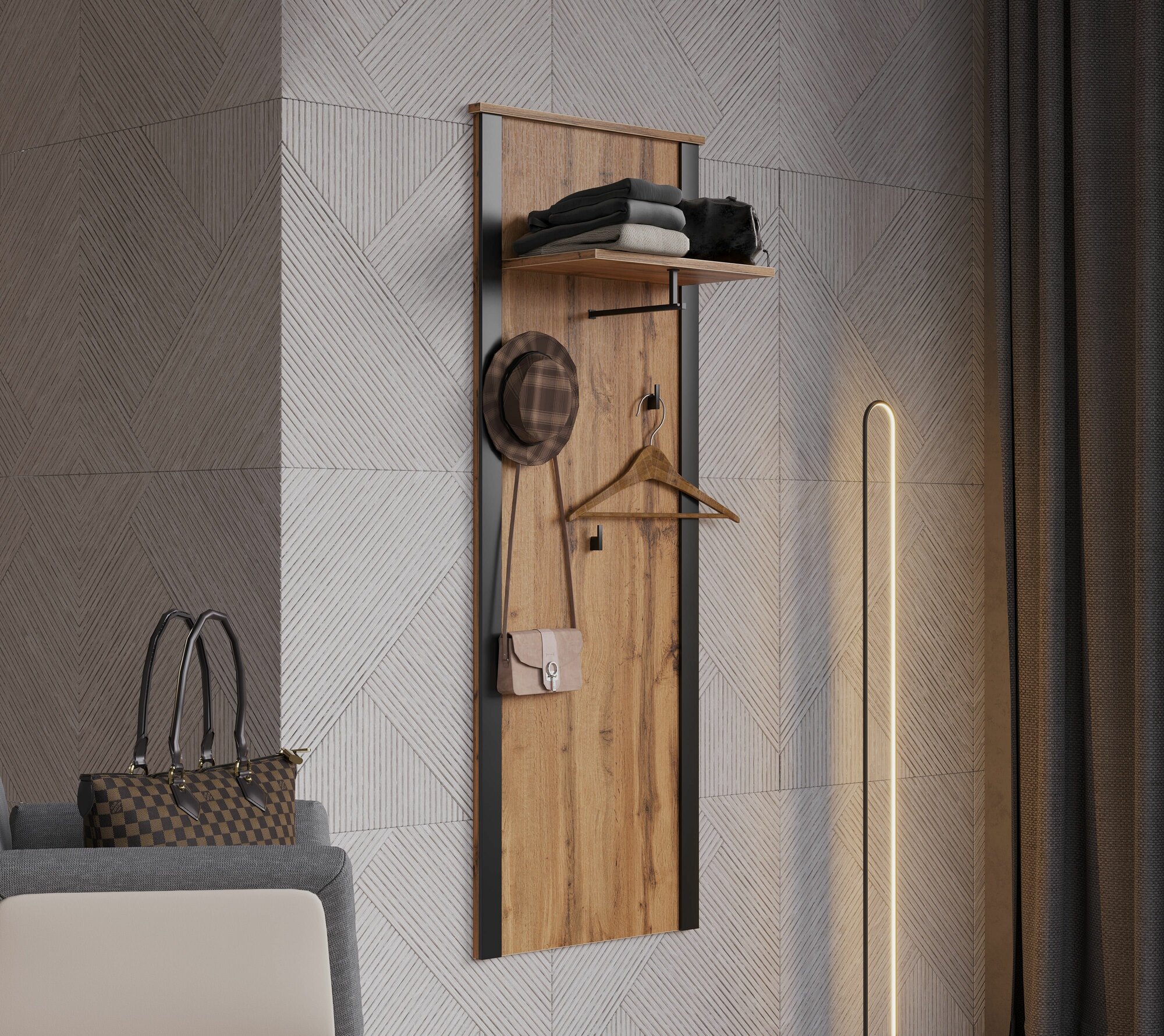 Щит и полка изготовлены из ламинированной ДСП спокойного цвета с приятным рисунком дерева. Боковые черные планки — из МДФ. Грамотно организовать систему хранения вещей - это достаточно сложная задача, но справиться с ней можно, используя вешалки Для прихожей от производителя . Прямые вешалки правильно организуют пространство, но при этом не займут много свободного места.